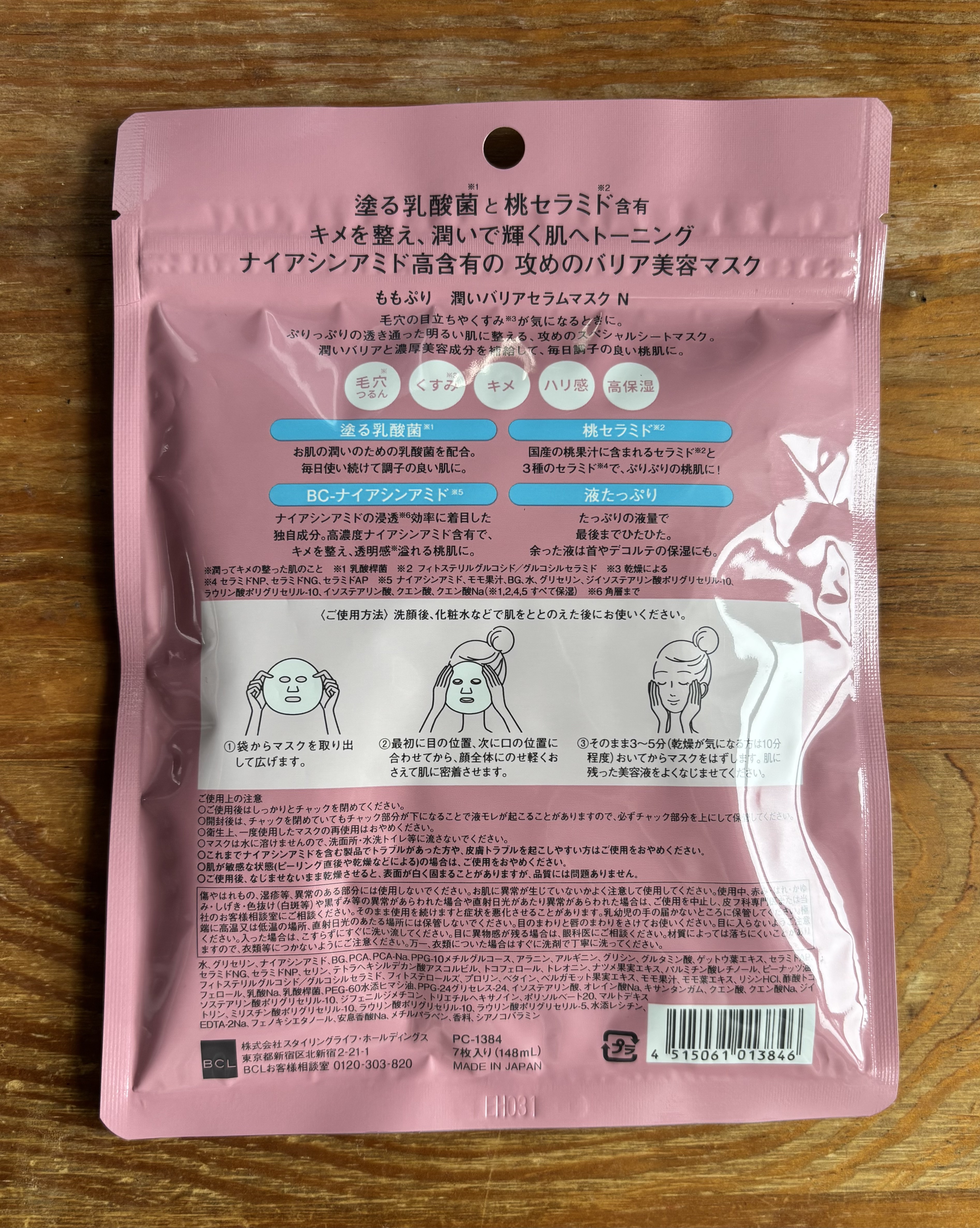 - <潤いバリアセラムマスク N> 水、グリセリン、ナイアシンアミド、BG、PCA、PCA-Na、PPG-10メチルグルコース、アラニン、アルギニン、グリシン、グルタミン酸、ゲットウ葉エキス、セラミドAP、セラミドNG、セラミドNP、セリン、テトラヘキシルデカン酸アスコルビル、トコフェロール、トレオニン、ナツメ果実エキス、パルミチン酸レチノール、ピーナッツ油、フィトステリルグルコシド/グルコシルセラミド、フィトステロールズ、プロリン、ベタイン、ベルガモット果実エキス、モモ果汁、モモ葉エキス、リシンHCl、酢酸トコフェロール、乳酸Na、乳酸桿菌、PEG-60水添ヒマシ油、PPG-24グリセレス-24、イソステアリン酸、オレイン酸Na、キサンタンガム、クエン酸、クエン酸Na、ジイソステアリン酸ポリグリセリル-10、ジフェニルジメチコン、トリエチルヘキサノイン、ポリソルベート20、マルトデキストリン、ミリスチン酸ポリグリセリル-10、ラウリン酸ポリグリセリル-10、ラウリン酸ポリグリセリル-5、水添レシチン、EDTA-2Na、フェノキシエタノール、安息香酸Na、メチルパラベン、香料、シアノコバラミン
