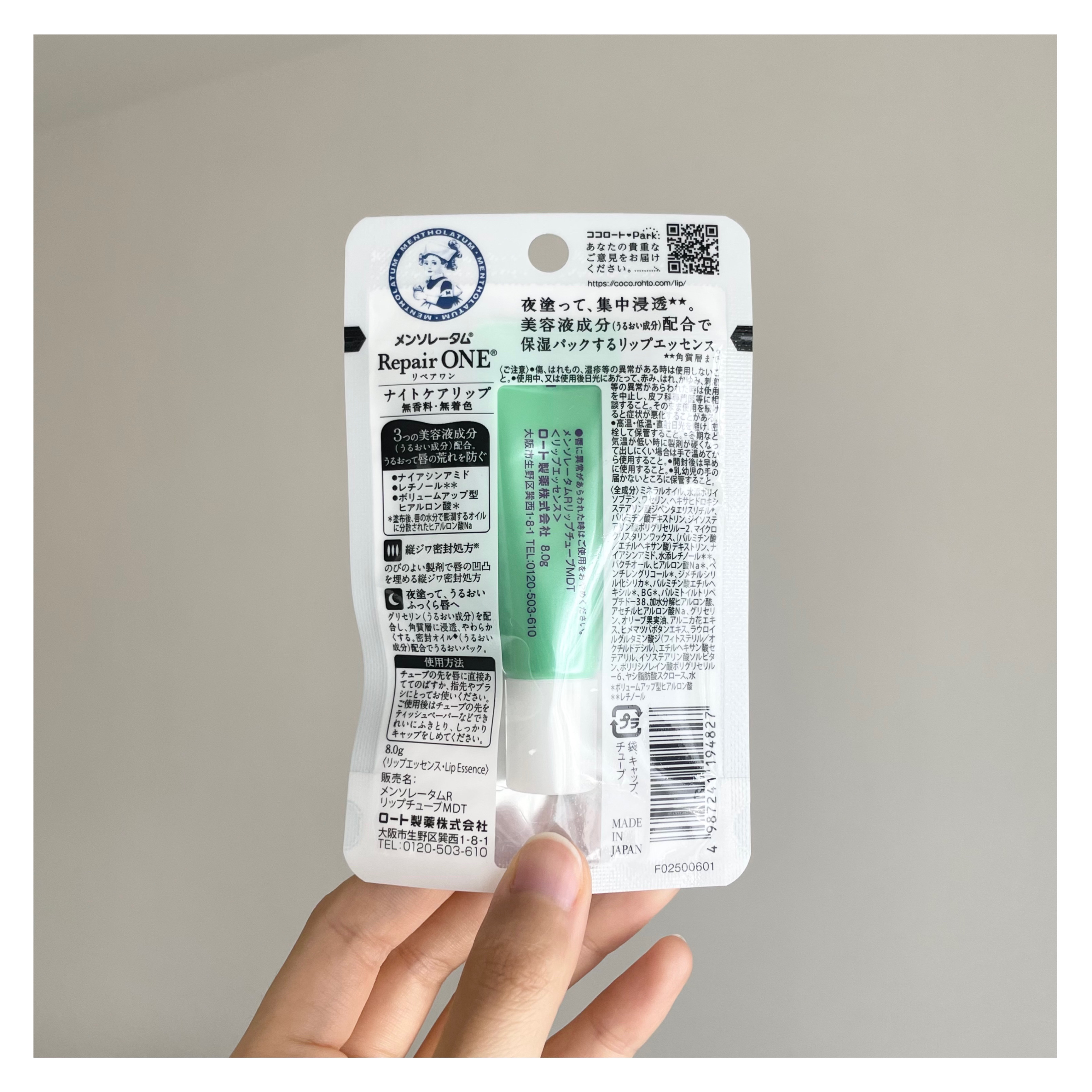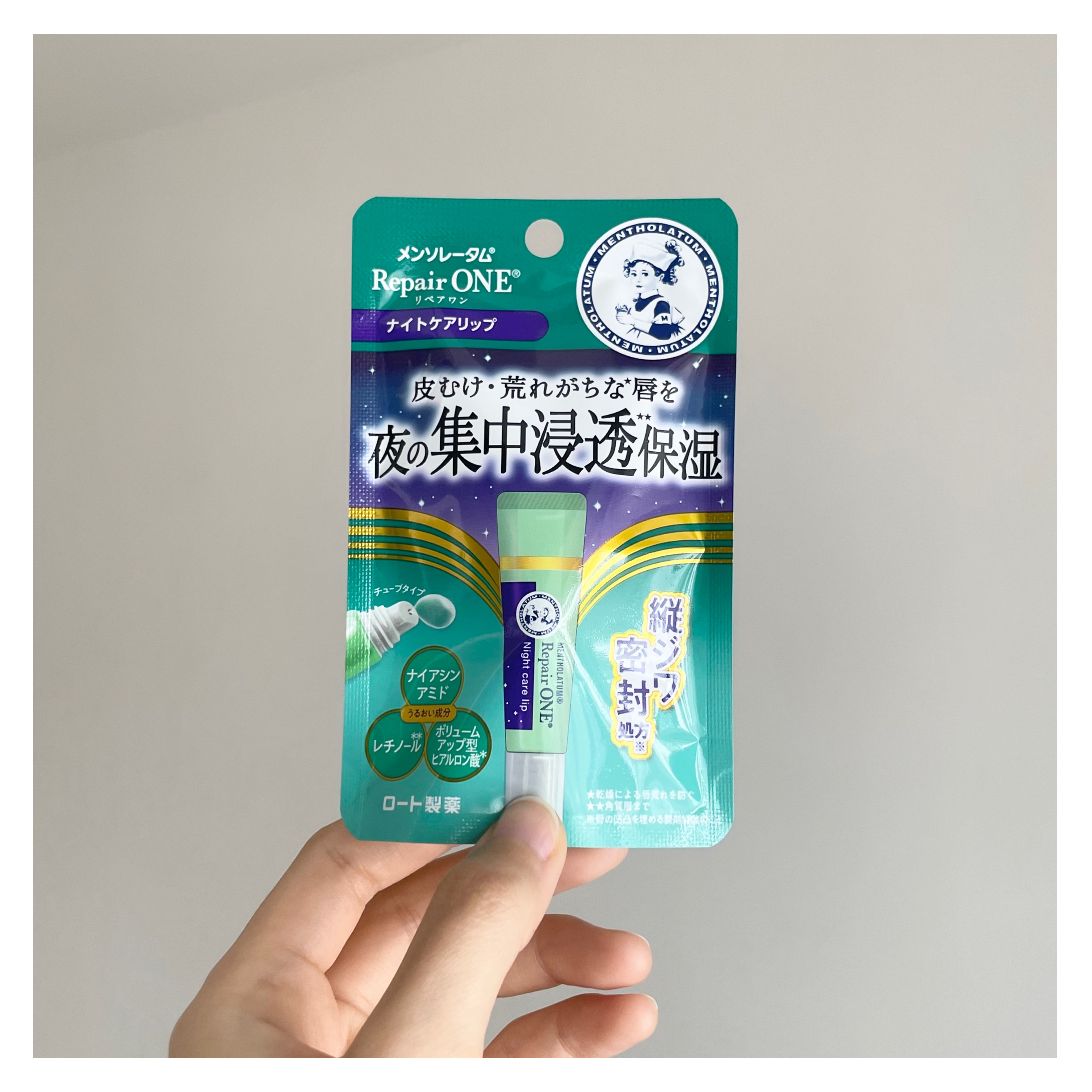- ※商品パッケージは予告なく変更する場合がありますのでご了承ください。 「メンソレータム リペアワン ナイトケアリップ」は夜塗って集中浸透*1、3つの美容液成分(うるおい成分)配合で保湿パックできるリップエッセンスです。 唇をすこやかに保って荒れを防ぎ、ふっくらとうるおいのある唇に導いてくれます。 さらに、チューブタイプで使いやすく、のびがよく唇の凹凸を埋める縦ジワ密封処方*2も特徴的。 夜塗ってふっくらうるおった唇へ。 *1角層まで *2唇の凹凸を埋める製剤特徴のこと
