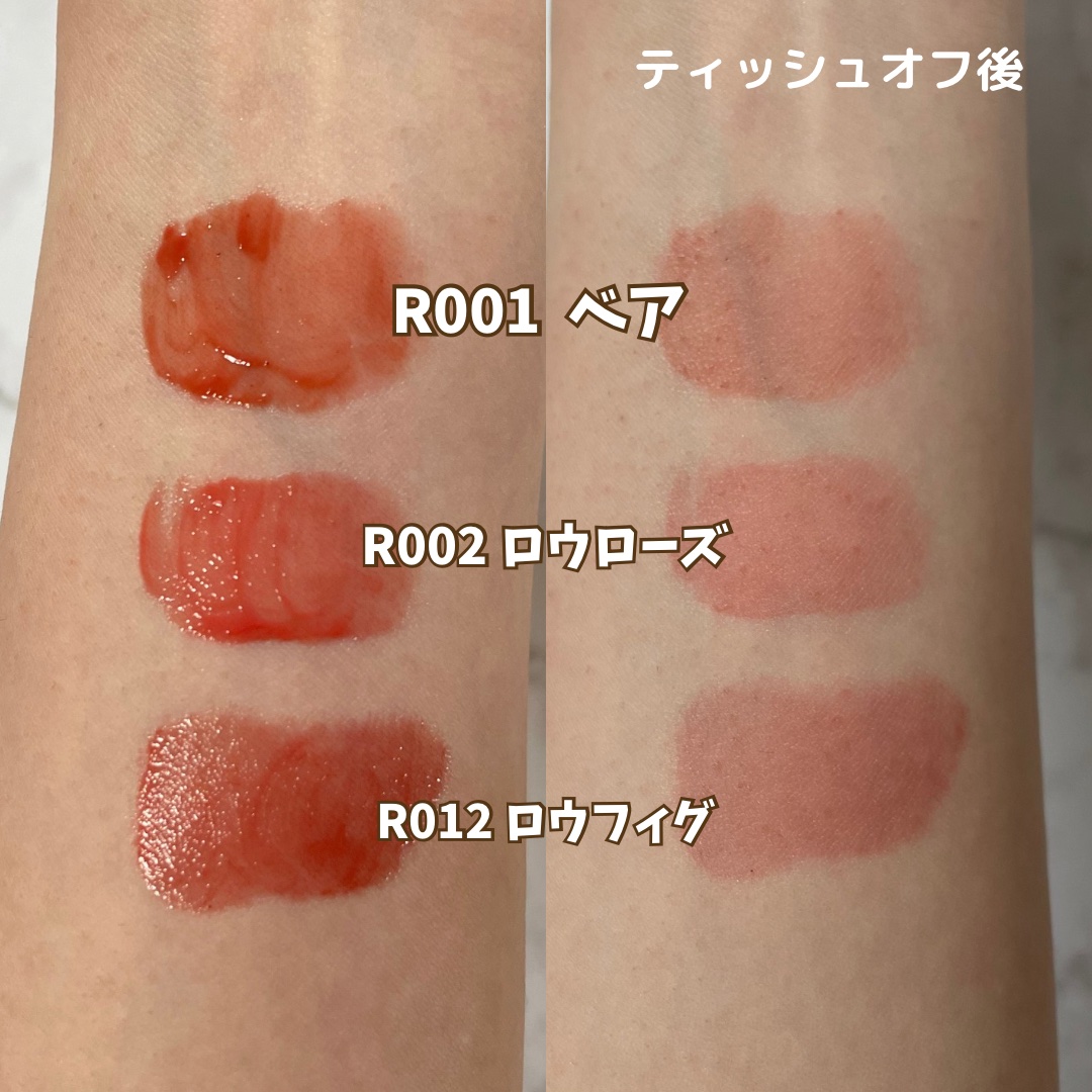 - <R001 ベア> 水、ジフェニルジメチコン、オクチルドデカノール、ビスジグリセリルポリアシルアジペート-2、リンゴ酸ジイソステアリル、トリメチルシロキシフェニルジメチコン、水添ポリイソブテン、ジグリセリン、ポリソルベート60、BG、セチルPEG/PPG-10/1ジメチコン、1,2-ヘキサンジオール、ペンチレングリコール、(アクリル酸ヒドロキシエチル/アクリロイルジメチルタウリンNa)コポリマー、セテアレス-20、スクワラン、フェノキシエタノール、酸化チタン、香料、エチルヘキシルグリセリン、黄5、赤227、イソステアリン酸ソルビタン、水酸化Al、ポリアクリル酸アンモニウム、酢酸トコフェロール、黄4、青1、ヒアルロン酸Na、(アルギニン/リシン)ポリペプチド、加水分解ヒアルロン酸、トコフェロール、アセチルヒアルロン酸Na、ソルビン酸 <R002 ロウローズ> 水、ジフェニルジメチコン、オクチルドデカノール、ビスジグリセリルポリアシルアジペート-2、リンゴ酸ジイソステアリル、トリメチルシロキシフェニルジメチコン、水添ポリイソブテン、ジグリセリン、ポリソルベート60、BG、セチルPEG/PPG-10/1ジメチコン、1,2-ヘキサンジオール、ペンチレングリコール、(アクリル酸ヒドロキシエチル/アクリロイルジメチルタウリンNa)コポリマー、セテアレス-20、スクワラン、フェノキシエタノール、酸化チタン、香料、エチルヘキシルグリセリン、黄5、赤227、イソステアリン酸ソルビタン、酢酸トコフェロール、水酸化Al、ポリアクリル酸アンモニウム、ヒアルロン酸Na、青1、加水分解ヒアルロン酸、(アルギニン/リシン)ポリペプチド、トコフェロール、アセチルヒアルロン酸Na、ソルビン酸 <R003 ロウプリコット> 水、ジフェニルジメチコン、オクチルドデカノール、ビスジグリセリルポリアシルアジペート-2、リンゴ酸ジイソステアリル、トリメチルシロキシフェニルジメチコン、水添ポリイソブテン、ジグリセリン、ポリソルベート60、BG、セチルPEG/PPG-10/1ジメチコン、1,2-ヘキサンジオール、ペンチレングリコール、(アクリル酸ヒドロキシエチル/アクリロイルジメチルタウリンNa)コポリマー、セテアレス-20、スクワラン、フェノキシエタノール、香料、エチルヘキシルグリセリン、酸化チタン、黄5、イソステアリン酸ソルビタン、赤227、酢酸トコフェロール、ヒアルロン酸Na、水酸化Al、ポリアクリル酸アンモニウム、加水分解ヒアルロン酸、青1、(アルギニン/リシン)ポリペプチド、トコフェロール、アセチルヒアルロン酸Na、ソルビン酸 <R004 フィーバー> 水、ジフェニルジメチコン、オクチルドデカノール、リンゴ酸ジイソステアリル、ビスジグリセリルポリアシルアジペート-2、トリメチルシロキシフェニルジメチコン、水添ポリイソブテン、ジグリセリン、ポリソルベート60、BG、セチルPEG/PPG-10/1ジメチコン、1,2-ヘキサンジオール、ペンチレングリコール、(アクリル酸ヒドロキシエチル/アクリロイルジメチルタウリンNa)コポリマー、セテアレス-20、スクワラン、フェノキシエタノール、香料、エチルヘキシルグリセリン、黄5、赤227、イソステアリン酸ソルビタン、酢酸トコフェロール、ヒアルロン酸Na、加水分解ヒアルロン酸、(アルギニン/リシン)ポリペプチド、トコフェロール、アセチルヒアルロン酸Na、ソルビン酸 <R005 ハイビスカス> 水、ジフェニルジメチコン、オクチルドデカノール、ビスジグリセリルポリアシルアジペート-2、リンゴ酸ジイソステアリル、トリメチルシロキシフェニルジメチコン、水添ポリイソブテン、ジグリセリン、ポリソルベート60、BG、セチルPEG/PPG-10/1ジメチコン、1,2-ヘキサンジオール、ペンチレングリコール、アクリル酸ヒドロキシエチル/アクリロイルジメチルタウリンNa)コポリマー、セテアレス-20、スクワラン、フェノキシエタノール、香料、エチルヘキシルグリセリン、赤227、黄5、イソステアリン酸ソルビタン、赤104(1)、酢酸トコフェロール、ヒアルロン酸Na、加水分解ヒアルロン酸、(アルギニン/リシン)ポリペプチド、トコフェロール、アセチルヒアルロン酸Na、ソルビン酸 <R006 ロウグレープ> 水、ジフェニルジメチコン、ビスジグリセリルポリアシルアジペート-2、リンゴ酸ジイソステアリル、オクチルドデカノール、トリメチルシロキシフェニルジメチコン、水添ポリイソブテン、ジグリセリン、ポリソルベート60、BG、セチルPEG/PPG-10/1ジメチコン、1,2-ヘキサンジオール、ペンチレングリコール、(アクリル酸ヒドロキシエチル/アクリロイルジメチルタウリンNa)コポリマー、セテアレス-20、スクワラン、酸化チタン、フェノキシエタノール、香料、エチルヘキシルグリセリン、黄5、赤227、イソステアリン酸ソルビタン、水酸化Al、ポリアクリル酸アンモニウム、酢酸トコフェロール、ヒアルロン酸Na、青1、加水分解ヒアルロン酸、(アルギニン/リシン)ポリペプチド、トコフェロール、アセチルヒアルロン酸Na、ソルビン酸 <R007 チル> 水、ジフェニルジメチコン、オクチルドデカノール、ビスジ