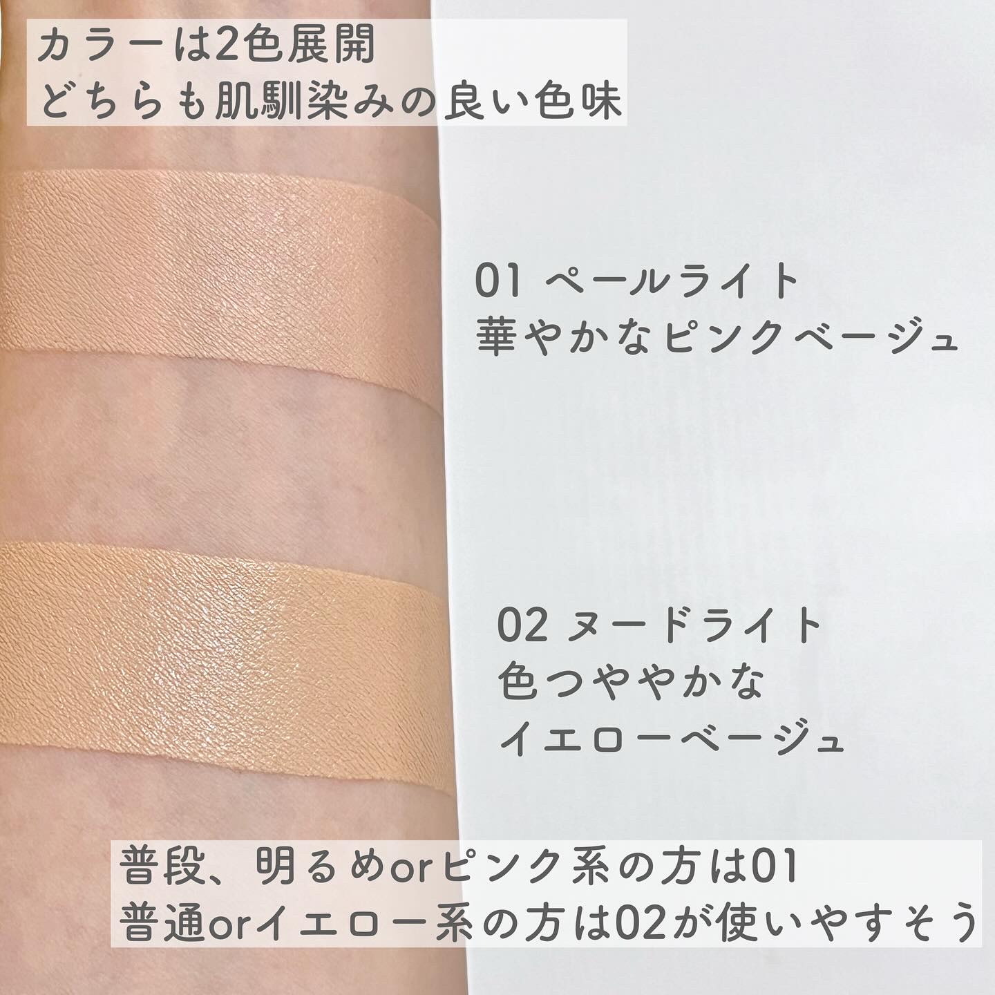 - <02 NUDE LIGHT(23号)> 水、酸化チタン、シクロペンタシロキサン、メチルトリメチコン、プロパンジオール、エチルヘキシルメトキシシンナメート、ポリメチルメタクリレート、ブチルオクチルサリチル酸、カプリリルメチコン、ラウリルPEG-8ジメチコン、トリメチルシロキシケイ酸、シクロヘキサシロキサン、ナイアシンアミド、ナイロン-12、PEG-10ジメチコン、HDI/トリメチロールヘキシルラクトンクロスポリマー、酸化鉄(CI 77492)、塩化ナトリウム、ブチレングリコール、ジステアジモニウムヘクトライト、水酸化アルミニウム、セチルPEG/PPG-10/1ジメチコン、スベリヒユエキス、ステアリン酸、ジメチコン、パンテノール、トリエトキシカプリリルシラン、酸化鉄(CI 77491)、安息香酸ナトリウム、ジメチコン/ビニルジメチコンクロスポリマー、酸化鉄(CI 77499)、ソルビン酸カリウム、香料、トコフェリルアセテート、エチルヘキシルグリセリン、トリソジウムエチレンジアミンジコハク酸、アデノシン、シリカ、1,2-ヘキサンジオール、ヒアルロン酸、加水分解ヒアルロン酸、ヒアルロン酸ナトリウム、チャ葉水、ティーツリー葉エキス、ペンタエリスリチルテトラ-ジ-t-ブチルヒドロキシヒドロケイヒ酸エステル、トコフェロール