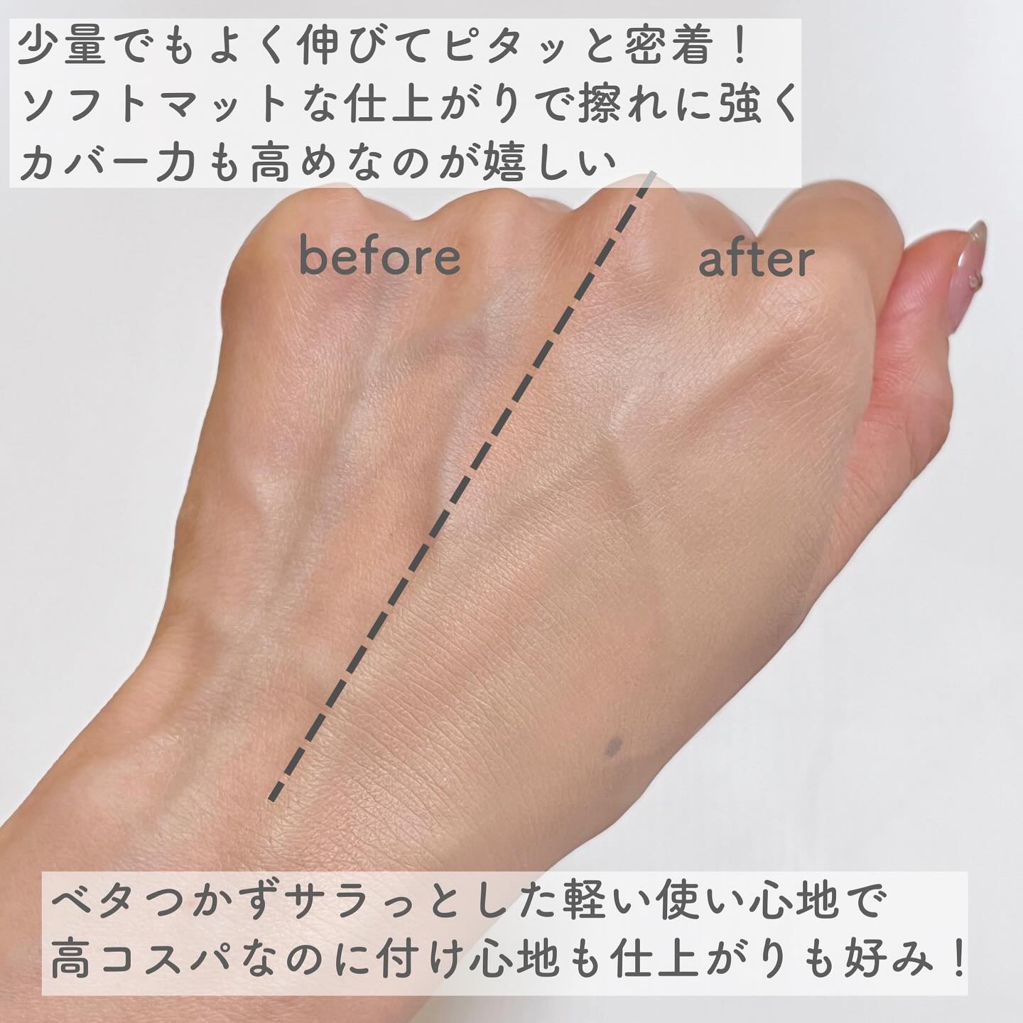 - シルクのような滑らかなテクスチャーで、肌にしっかり密着。毛穴やテクスチャーをカバーし、自然なマット感を実現します。軽い使い心地で長時間崩れにくく、UVカット機能(SPF50+ PA+++)で日中の紫外線もカット◎。 日常使いにぴったりな、軽やかで持続力のある仕上がりを提供します。