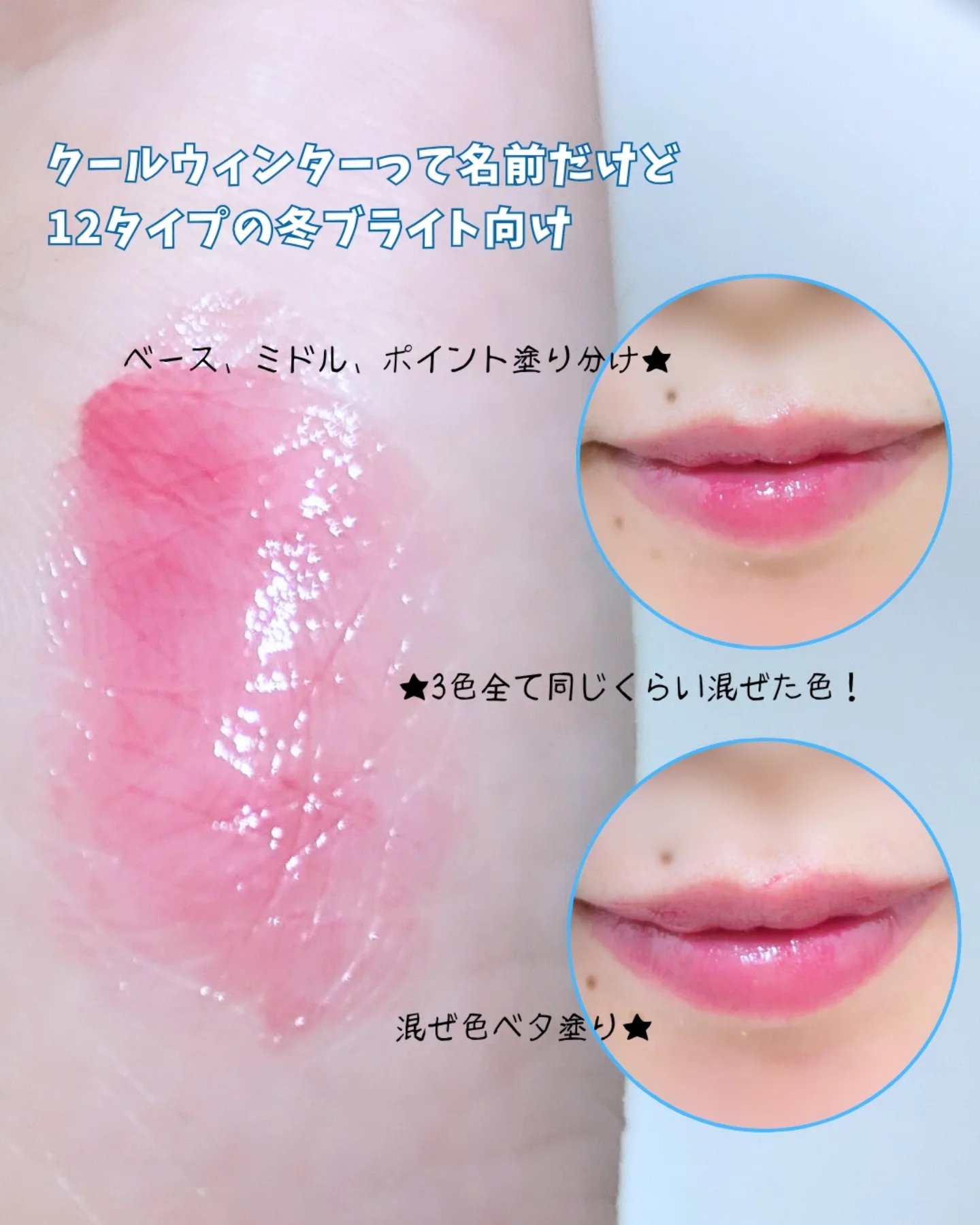 | 青みピンクで色白の方はとっても肌に馴染みやすいカラーだと思います◎ ツヤ感のある仕上がりになるリップティントで、色持ちも十分でした。 | 詳細を見る | |||