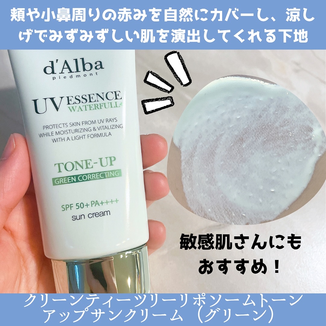 \好みや肌タイプに合わせて選べる/人気のd'Albaの日焼け止め下地3種をレビュー❤以前パープルを頂いてから気に入ってリピ買いしたウォータフルトーンアップサンクリーム😍今回初めてピンクとグリーンもお試ししたんだけど3色それぞれ違っててどれも良...