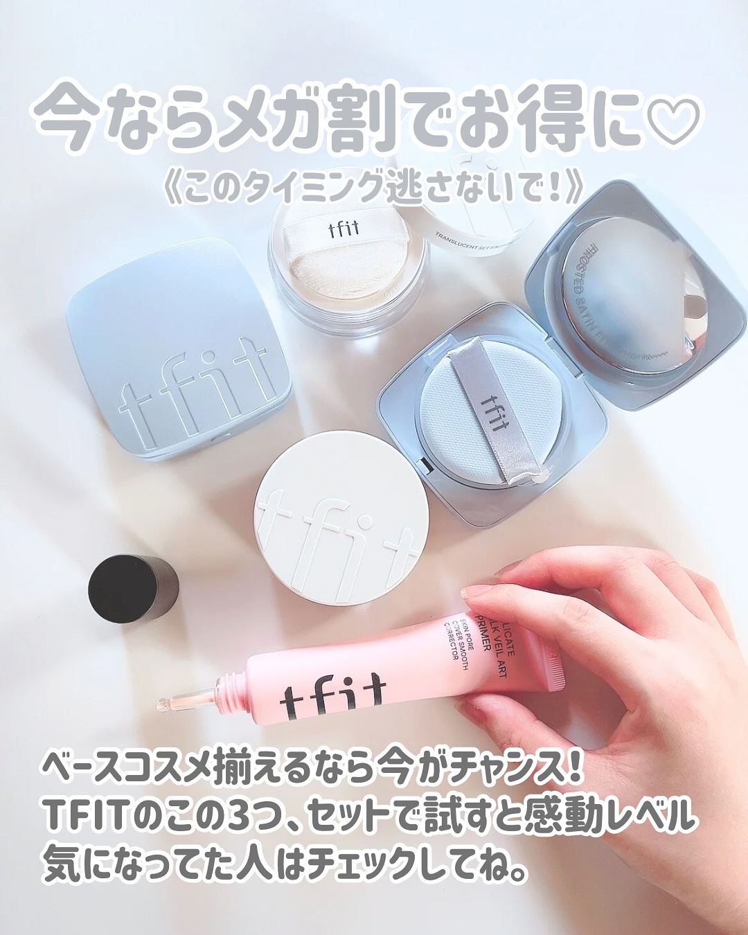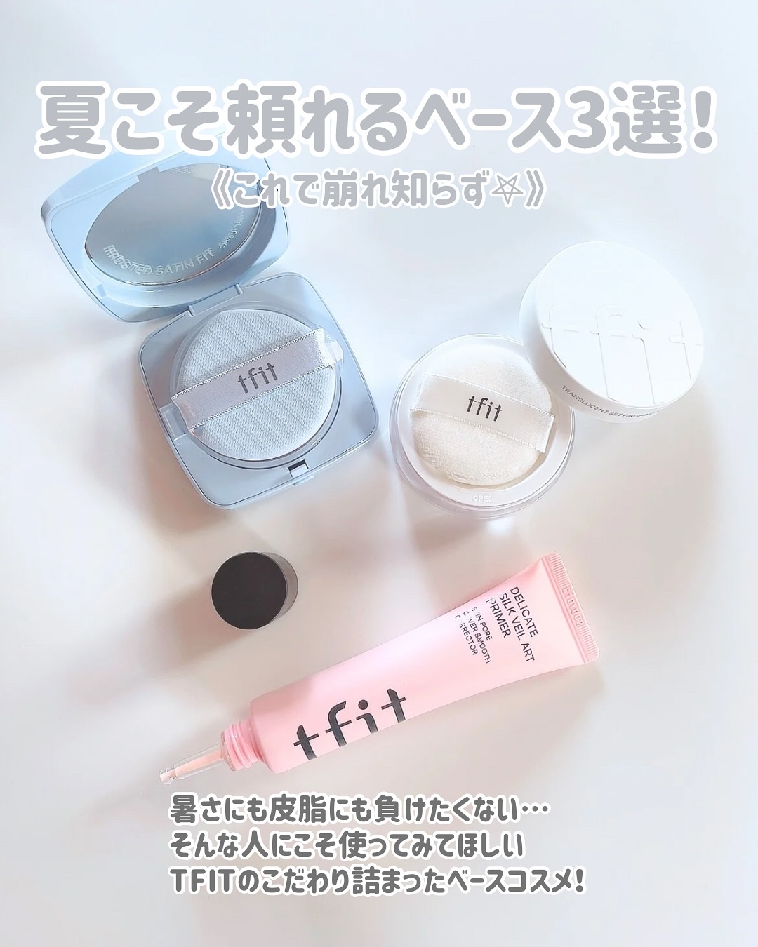 .✾TFIT・アイシーフィットカバークッションEX・デリケートシルクヴェールアートプライマー・トランスルーセントセットフィニッシングパウダー..化粧崩れしにくくなる、夏の必須アイテムたち☀️..アイシーフィットカバークッションEXは肌に塗布し...