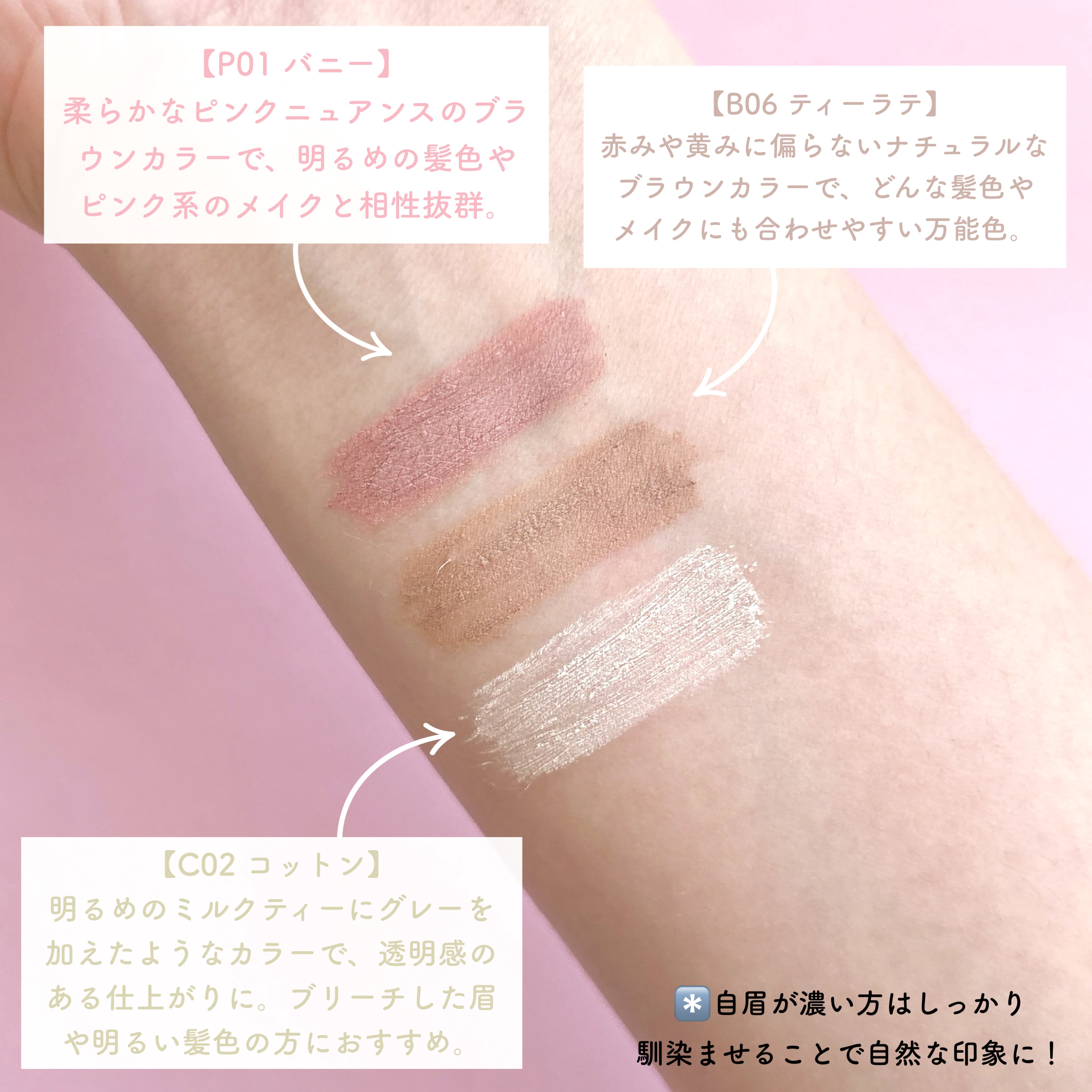 - POINT 1|極細ブラシで毛流れ自在 眉毛1本1本をキャッチする約1cmの極細スキニーブラシを採用。細かい部分まで塗りやすく、毛流れを整えながら、思い通りの仕上がりに。 POINT 2|ニュアンスカラーで垢抜け眉に ミュート&ニュートラルなカラー展開で、 “ナチュふわ”な抜け感眉を簡単に演出できます。 髪色や肌トーンに合わせて選べる4色展開。 POINT 3|軽やかなテクスチャー ダマになりにくく、時間が経ってもパリパリしにくい快適な使用感。軽やかなテクスチャーで、自然な仕上がりをキープします。 10月11日より全国のロフト、アインズ&トルペにて順次先行発売を開始
