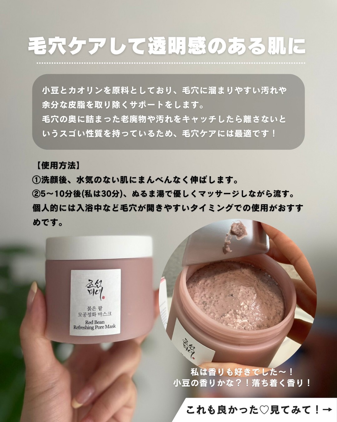 .【購入品正直レビュー】★★★★★:リピあり(ストックあり)日焼け止めで人気な朝鮮美女の小豆マスク🫘これいつも売り切れてるから、もはや幻的なマスクだと思ってる😂肌のザラつき・毛穴が気になる時に使うと肌がフワフワになる!!💃小豆🫘なんだけどザラ...