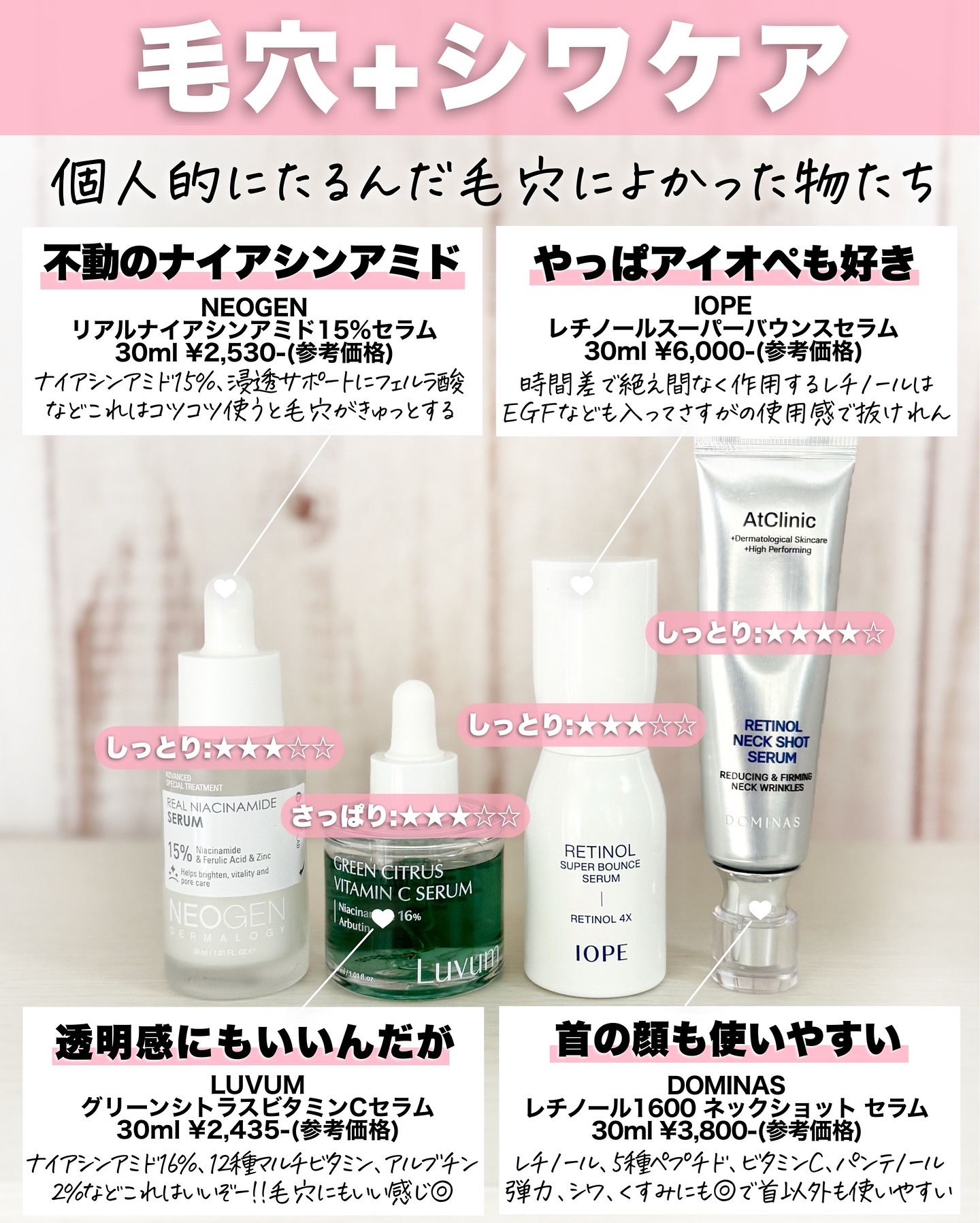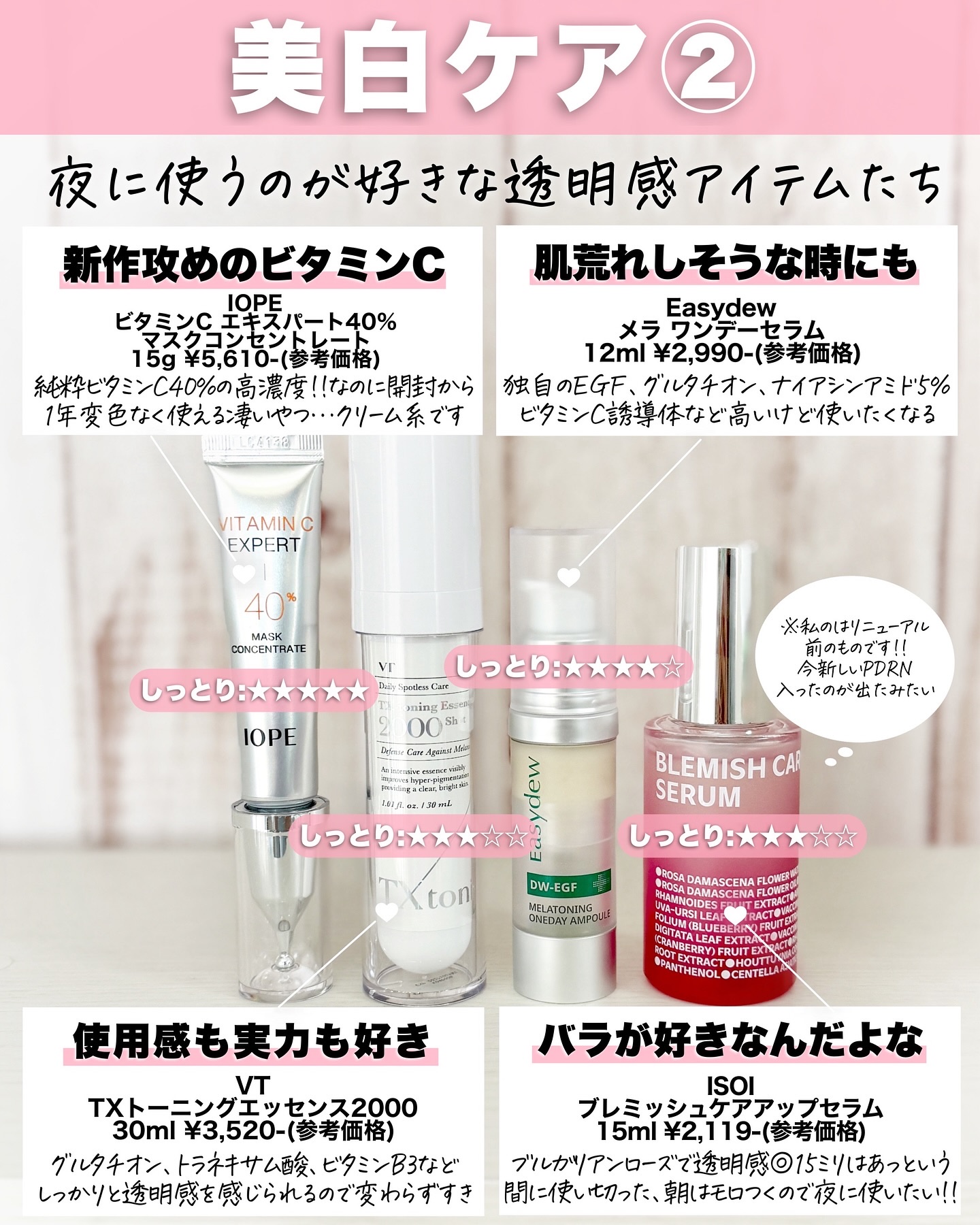 ドクダミ🌿とシラカバ🤫🩵 昔から出てたドクダミ美容液は配合成分がシンプル トラネキサム酸配合の新作かな☺️ 正直、桃セラム🍑も使用感はすきなんだけど ビタミンCはトラネキサム酸に比べて 透明感を感じるのが私は早いです!