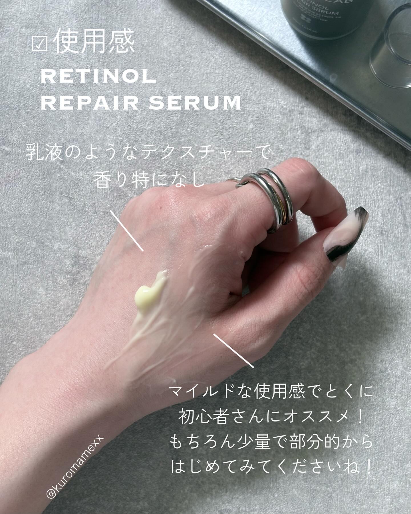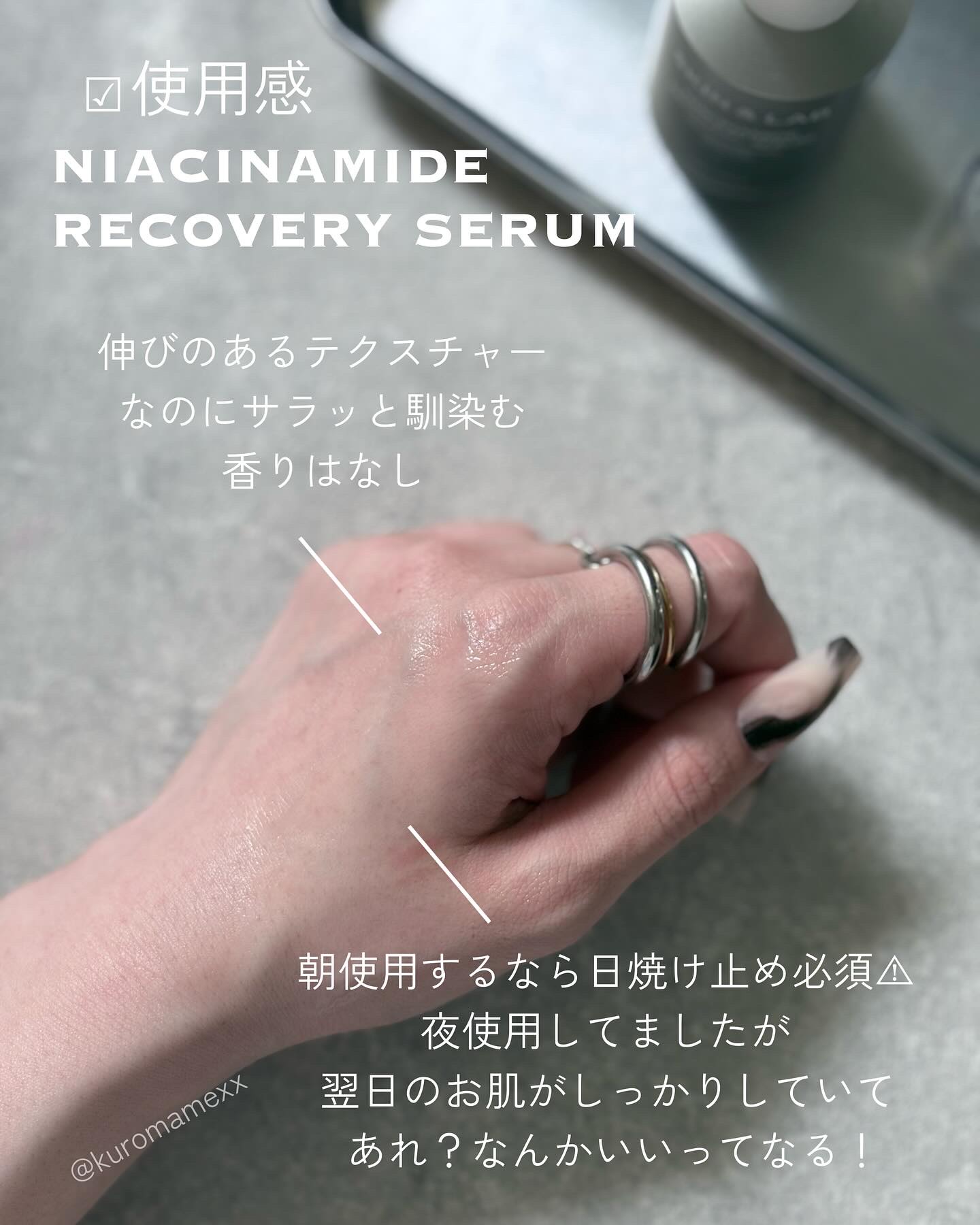 トロみのあるテクスチャーで スッと馴染みますが、 ベタつきは残るかと思います。 30mlですが、少量で伸びるので コスパはかなりいいかなーと 思うのですが容器が茶色なので 減りがわからないのが残念(笑) アゼライン酸の後に シカ成分の美容液を使用していたので それが刺激を抑えてくれていたのかも しれません。