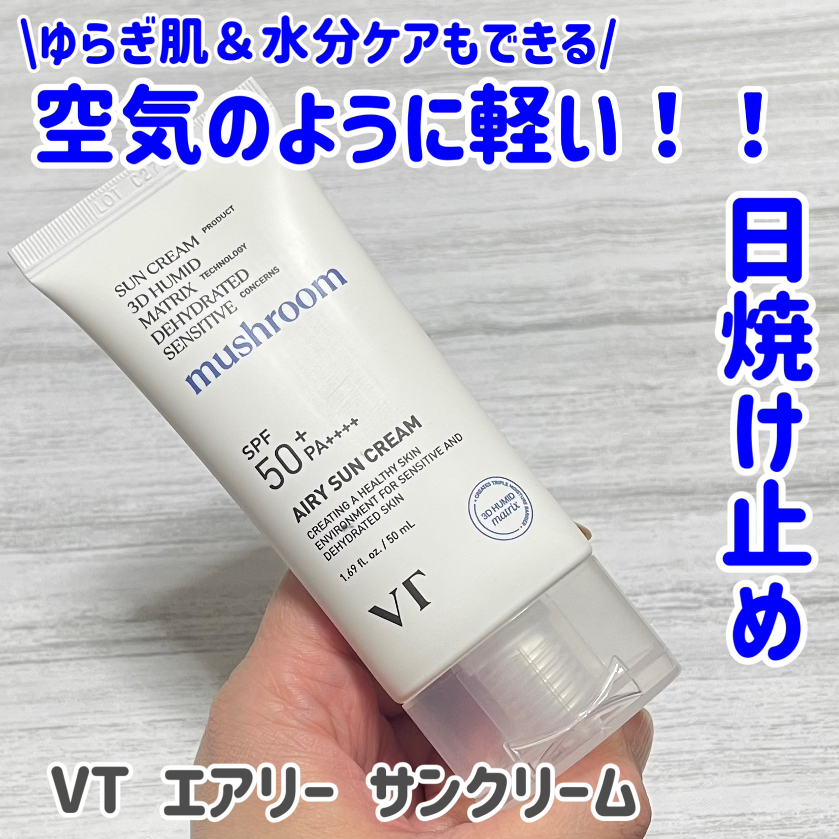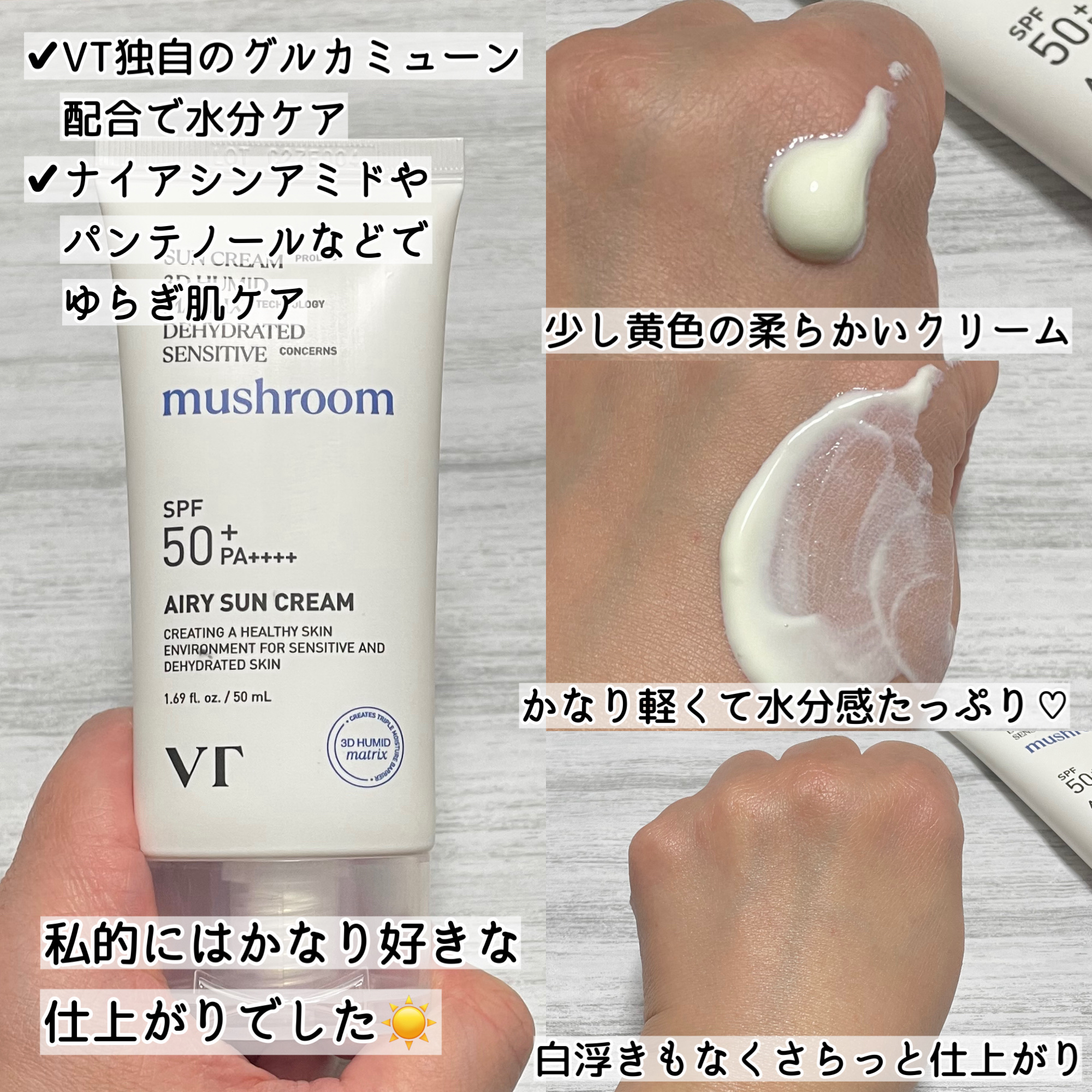 - 朝のスキンケアの仕上げに、水分クリーム感覚で手軽に塗れるSPF50+サンクリーム。 紫外線を防ぐのはもちろん、みずみずしい肌へ導くスキンケアも同時に! まるでスキンケアをするように水分感たっぷり、 日焼け止め効果もしっかりSPF50+,PA++++あるサンクリームがVTから新登場! 保湿に特化したキノコ由来の成分をVTが厳選してブレンド、 さらに整肌成分として有名なナイアシンアミドも配合されているので、 1日中外でもスキンケアができちゃう! 白浮きしたり、キシキシするのが苦手で、 水分クリームのようなテクスチャーの日焼け止めを探していた方におすすめ! ■このような方へおすすめ 乾燥でメイクが崩れやすい方 塗ってないような軽い付け心地の日焼け止めをお探しの方 きしきししにくい日焼け止めをお探しの方 白浮きしにくい日焼け止めをお探しの方