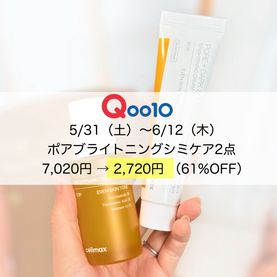 Qoo10メガ割‼︎スタート🌟ブライトニングケアにおすすめセットが5/31〜6/12まで7.020円▶︎2.720円(61%OFF)@celimax.japancelimaxポアブライトニングシミケア2点セット⚫︎ポアブライトニングシミケアセ...