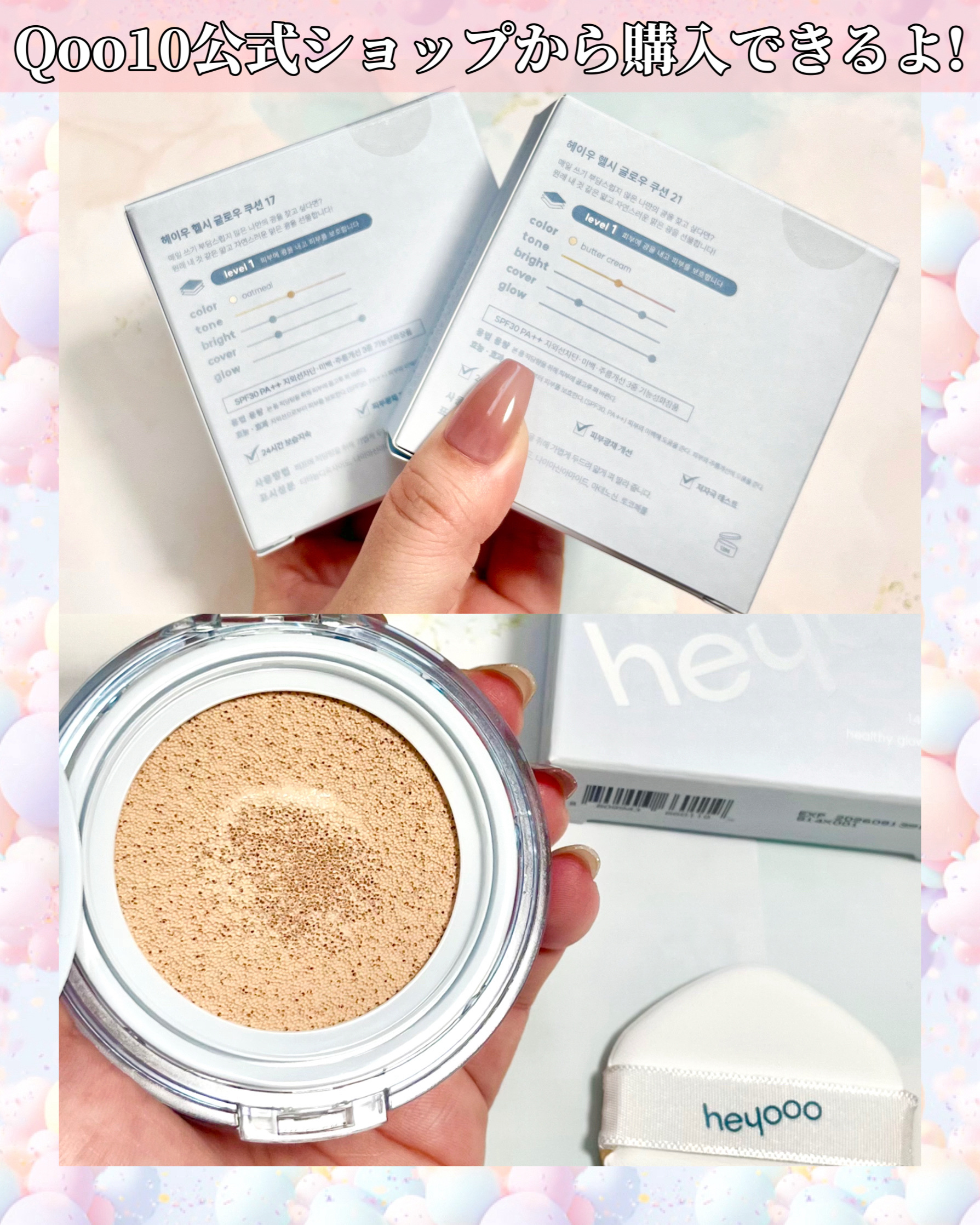 光沢肌で健康的で生き生きした表情に🥰heyoooヘルシーグロウクッション使ってみたよ🩵🩵🩵17号oatmeal21号buttercreamの2色展開。みずみずしいうるうるツヤツヤテクスチャー✨伸びがいいからお肌にしっとり密着して気になる部分...