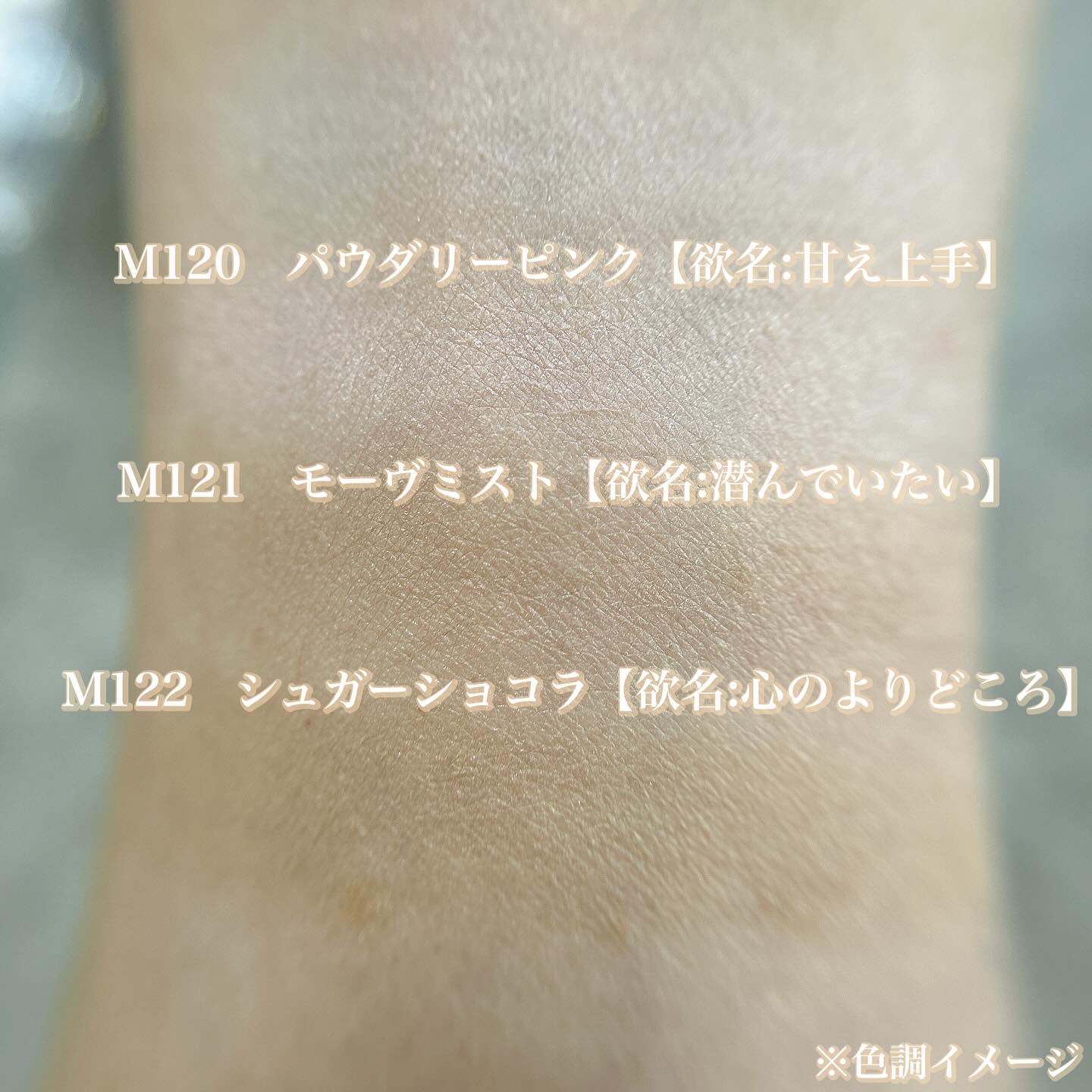 - <068 レッドブラウン> タルク、リンゴ酸ジイソステアリル、ジメチコン、シリカ、ジエチルヘキサン酸ネオペンチルグリコール、ワセリン、ミリスチン酸亜鉛、ジステアリン酸Al、セスキイソステアリン酸ソルビタン、トコフェロール、クロルフェネシン、デヒドロ酢酸Na、(+/-)グンジョウ、マイカ、酸化チタン、酸化鉄、水酸化Al、硫酸Ba <069 ピンクベージュ> タルク、リンゴ酸ジイソステアリル、ジメチコン、ジエチルヘキサン酸ネオペンチルグリコール、ヘキサ(ヒドロキシステアリン酸/ステアリン酸/ロジン酸)ジペンタエリスリチル、シリカ、ミリスチン酸亜鉛、セスキイソステアリン酸ソルビタン、トコフェロール、クロルフェネシン、デヒドロ酢酸Na、(+/-)グンジョウ、マイカ、酸化チタン、酸化鉄、硫酸Ba、酸化スズ、ホウケイ酸(Ca/Al)、赤226 <070【マット】フォグピンク> タルク、マイカ、合成フルオロフロゴパイト、リンゴ酸ジイソステアリル、スクワラン、ワセリン、ジメチコン、シリカ、セスキイソステアリン酸ソルビタン、トコフェロール、エチルパラベン、メチルパラベン、デヒドロ酢酸Na、(+/-)カオリン、グンジョウ、酸化チタン、酸化鉄、水酸化Al、赤226 <071【グリッター】トープブラウン> タルク、マイカ、リンゴ酸ジイソステアリル、合成フルオロフロゴパイト、スクワラン、ジメチコン、ワセリン、セスキイソステアリン酸ソルビタン、トコフェロール、エチルパラベン、メチルパラベン、デヒドロ酢酸Na、(+/-)カオリン、グンジョウ、酸化チタン、酸化鉄、酸化スズ、ホウケイ酸(Ca/Al)、赤226 <M117 ピュアミルク(限定)> タルク、合成フルオロフロゴパイト、ステアリン酸エチルヘキシル、シリカ、窒化ホウ素、ジメチコン、リンゴ酸ジイソステアリル、ヘキサ(ヒドロキシステアリン酸/ステアリン酸/ロジン酸)ジペンタエリスリチル、カルナウバロウ、イソステアリン酸ソルビタン、トコフェロール、クロルフェネシン、デヒドロ酢酸Na、(+/-)グンジョウ、マイカ、酸化チタン、酸化鉄、水酸化Al、赤226 <M118 アイボリー(限定)> タルク、合成フルオロフロゴパイト、ステアリン酸エチルヘキシル、シリカ、窒化ホウ素、ジメチコン、リンゴ酸ジイソステアリル、ヘキサ(ヒドロキシステアリン酸/ステアリン酸/ロジン酸)ジペンタエリスリチル、カルナウバロウ、イソステアリン酸ソルビタン、トコフェロール、クロルフェネシン、デヒドロ酢酸Na、(+/-)グンジョウ、マイカ、酸化チタン、酸化鉄、水酸化Al、赤226 <M119 ペールライラック(限定)> タルク、合成フルオロフロゴパイト、ステアリン酸エチルヘキシル、シリカ、窒化ホウ素、ジメチコン、リンゴ酸ジイソステアリル、ヘキサ(ヒドロキシステアリン酸/ステアリン酸/ロジン酸)ジペンタエリスリチル、カルナウバロウ、イソステアリン酸ソルビタン、トコフェロール、クロルフェネシン、デヒドロ酢酸Na、(+/-)グンジョウ、マイカ、酸化チタン、酸化鉄、水酸化Al、赤226 <M120 パウダリーピンク(限定)> タルク、合成フルオロフロゴパイト、ステアリン酸エチルヘキシル、シリカ、窒化ホウ素、ジメチコン、リンゴ酸ジイソステアリル、ヘキサ(ヒドロキシステアリン酸/ステアリン酸/ロジン酸)ジペンタエリスリチル、カルナウバロウ、イソステアリン酸ソルビタン、トコフェロール、クロルフェネシン、デヒドロ酢酸Na、(+/-)グンジョウ、マイカ、酸化チタン、酸化鉄、水酸化Al、赤226 <M121 モーヴミスト(限定)> タルク、合成フルオロフロゴパイト、ステアリン酸エチルヘキシル、シリカ、窒化ホウ素、ジメチコン、リンゴ酸ジイソステアリル、ヘキサ(ヒドロキシステアリン酸/ステアリン酸/ロジン酸)ジペンタエリスリチル、カルナウバロウ、イソステアリン酸ソルビタン、トコフェロール、クロルフェネシン、デヒドロ酢酸Na、(+/-)グンジョウ、マイカ、酸化チタン、酸化鉄、水酸化Al、赤226 <M122 シュガーショコラ(限定)> タルク、合成フルオロフロゴパイト、ステアリン酸エチルヘキシル、シリカ、窒化ホウ素、ジメチコン、リンゴ酸ジイソステアリル、ヘキサ(ヒドロキシステアリン酸/ステアリン酸/ロジン酸)ジペンタエリスリチル、カルナウバロウ、イソステアリン酸ソルビタン、トコフェロール、クロルフェネシン、デヒドロ酢酸Na、(+/-)グンジョウ、マイカ、酸化チタン、酸化鉄、水酸化Al、赤226 <SP701 スパークルピンク(限定)> ジエチルヘキサン酸ネオペンチルグリコール、タルク、ジメチコン、リンゴ酸ジイソステアリル、ワセリン、カルナウバロウ、シリカ、セスキイソステアリン酸ソルビタン、トコフェロール、メチルパラベン、デヒドロ酢酸Na、(+/-)グンジョウ、マイカ、酸化チタン、酸化鉄、酸化スズ、ホウケイ酸(Ca/Al)、赤226 <SP702 スパークルフラッシュ(限定)> ジエチルヘキサン酸ネオペンチルグリコール、タルク、ジメチコン、リンゴ酸ジイソステアリル、ワセリン、カルナウバロウ、セスキイソステアリン酸ソルビタン、トコフェロール、メチルパラベン、デ