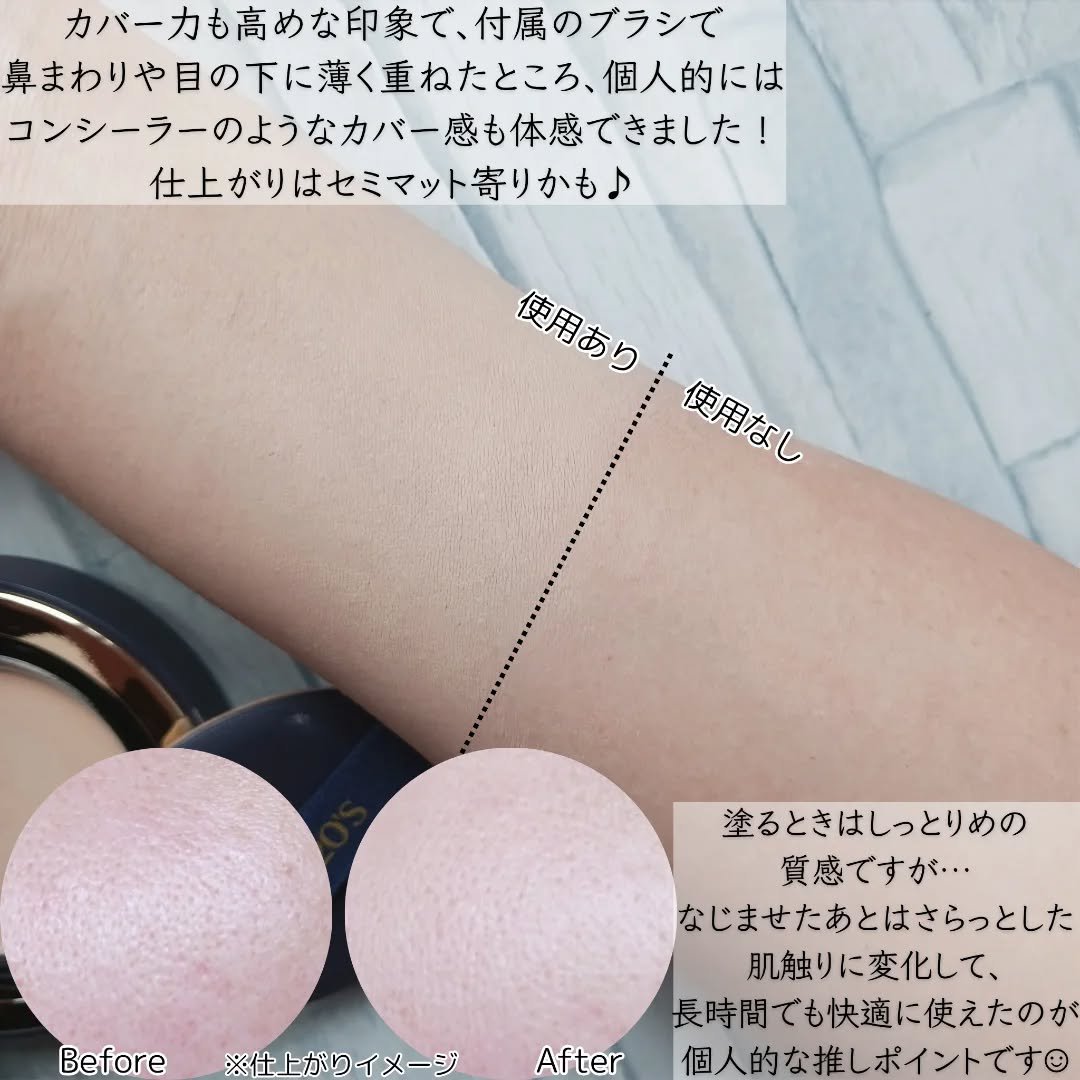 薄くムラなく肌に密着◁ キレイな仕上がりが長く続く♪ 軽い使い心地ではあるもののカバー力はかなり高め◁ 毛穴から肌の色ムラまでしっかりとカバーする事ができたので感動♡ 自然なマット感を求める方や…しっかりとしたカバー力が欲しいけど厚塗り感はNGって方に特に激推ししたいアイテムかも\(^o^)/