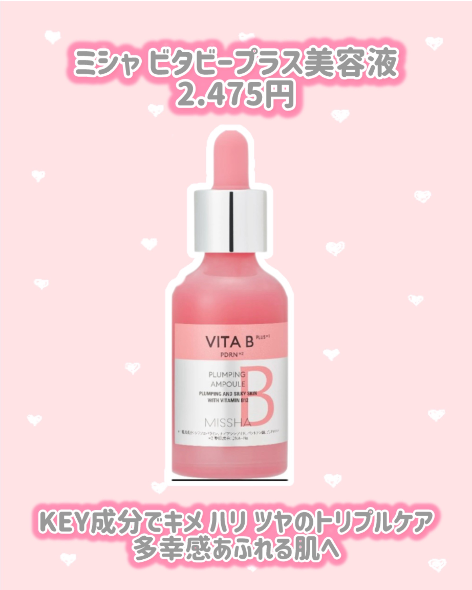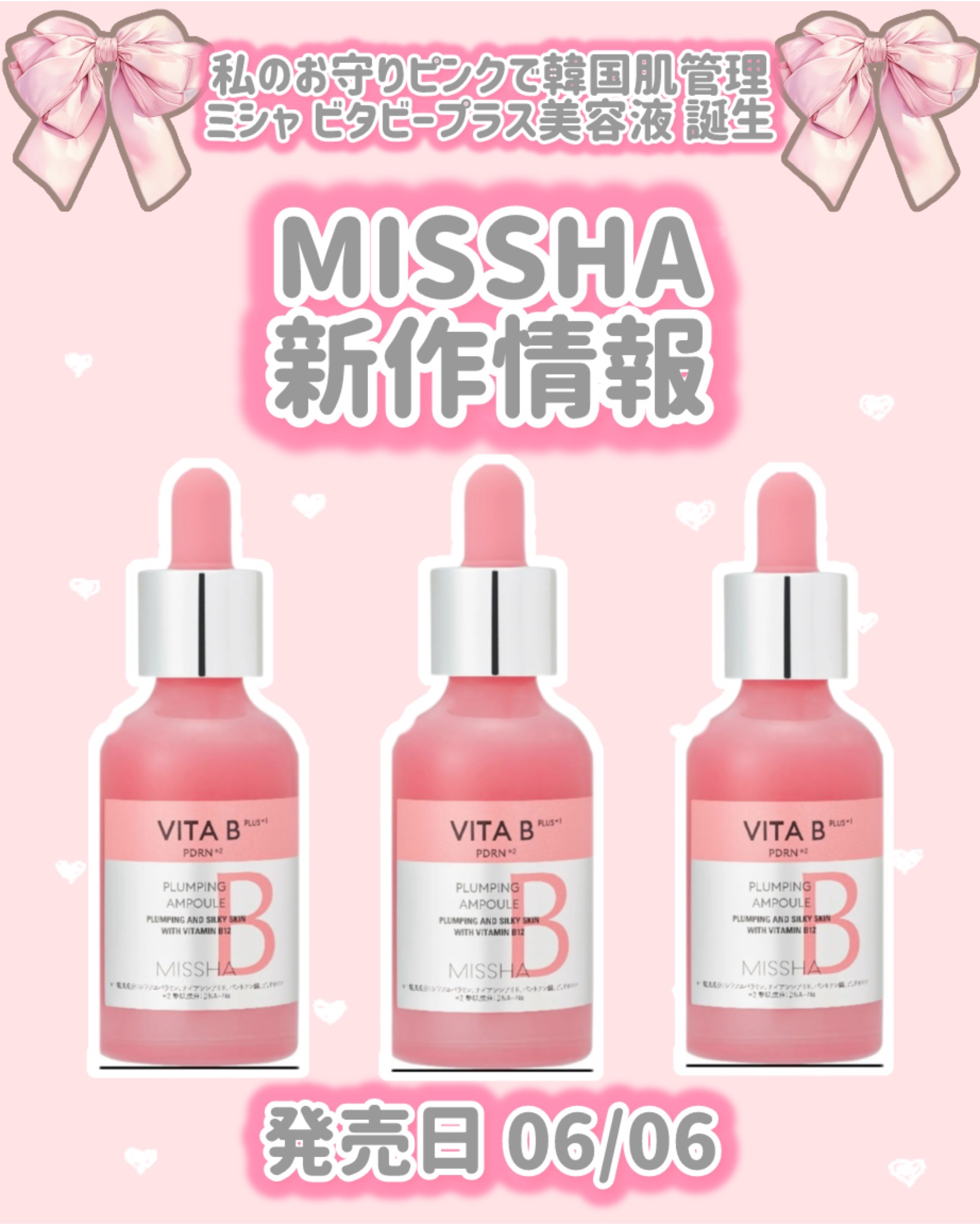 - 私のお守りピンクで韓国肌管理。ミシャビタビープラス美容液 誕生。 ぷるんとした肌、多幸感あふれる肌を目指すピンクのアンプル。 1 : ビタミンB12*1 ビタミンB12*1とも呼ばれるシアノコバラミン。原料本来がピンク色であることから「ピンクビタミン」と呼ばれることも。 目薬などにも使用されている守りのケア成分です。 光や大気や紫外線など、日々の外的ストレスから肌を保護し、肌本来のコンディションの整ったなめらかで健やかな肌を目指します。 2 : サーモン由来のPDRN*2 成⻑因子の分泌を促しコラーゲン・エラスチンの生成をサポートすることで知られ、韓国での美容施術を中心に注目されている成分です。 保湿効果も高く肌に潤いを与えるため、ハリや弾力のある肌にあこがれている方におすすめ。 本品はサーモンのPDRN*2を使用しており、人体のDNAと非常に近く副作用が少ないといわれていて敏感肌の方もご使用いただけます*3。 3 : 揺るがない肌を支えるビタミンB群 ビタミンB群の中でも美肌に効果があると注目されている3種を配合しました。 保湿作用、ハリツヤなどマルチな作用で知られるビタミンB3(ナイアシンアミド)、保湿力やトラブル肌予防が期待されるビタミンB5(パントテン酸)、肌の皮脂の分泌を抑制することでも知られるビタミンB6(ピリドキシン)を配合。 4 : 美肌菌をサポートする3種の発酵保湿成分 美しい肌の表皮にあると言われている「美肌菌」(表皮ブドウ球菌)の働きをサポートする乳酸菌発酵エキス2種と、美肌菌の1種であるバチルス菌による発酵エキス1種を配合。 肌機能を底上げし、美しく健やかな肌環境の土台を整えます。 5 : 韓国でも話題のΒ-グルカン*4 ヒアルロン酸よりも保湿力に優れている成分として注目されているβ-グルカン*4。 肌をバリアし、UVや大気、ストレスなどの日常の外的要因からのダメージを蓄積しない肌づくりをサポートします。 *1 整肌成分:シアノコバラミン *2 整肌成分:DNAーNa *3すべての方に刺激がないということではありません *4保湿成分 先行発売:5月7日(水) PLAZA・MINiPLA、@cosme store、@cosme shopping