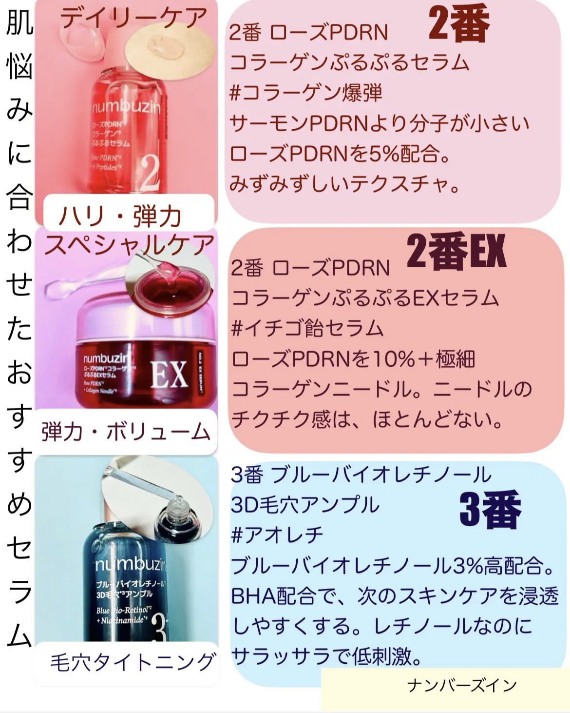 \ナンバーズインからセラム4種が新発売 /🩷2番ローズPDRNコラーゲンぷるぷるセラム❤️2番ローズPDRNコラーゲンぷるぷるEXセラム🩵3番ブルーバイオレチノール3D毛穴アンプル🤍4番AHAセラミドスキンピールセラム2番ローズPDRNコラー...