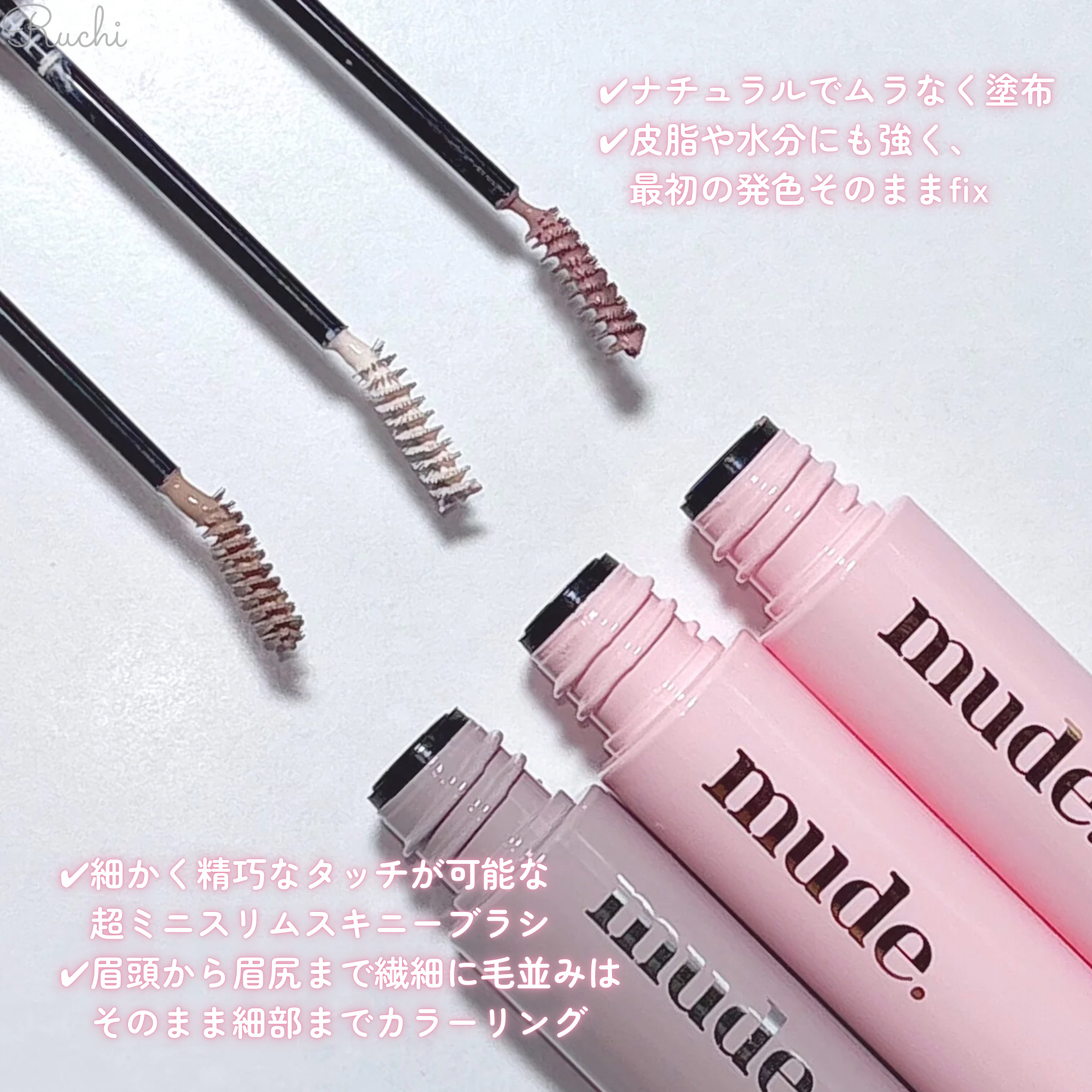 mudeインスパイアスキニーブロウカラB01ミルクティー一番明るいカラー、脱色した髪にC01フェードインブロウコンシーラー、カラーチェンジ前のベース用P01バニー雰囲気のある落ち着いたアッシュカラーモビッシュピンクミュート、アッシュ系のカラー...