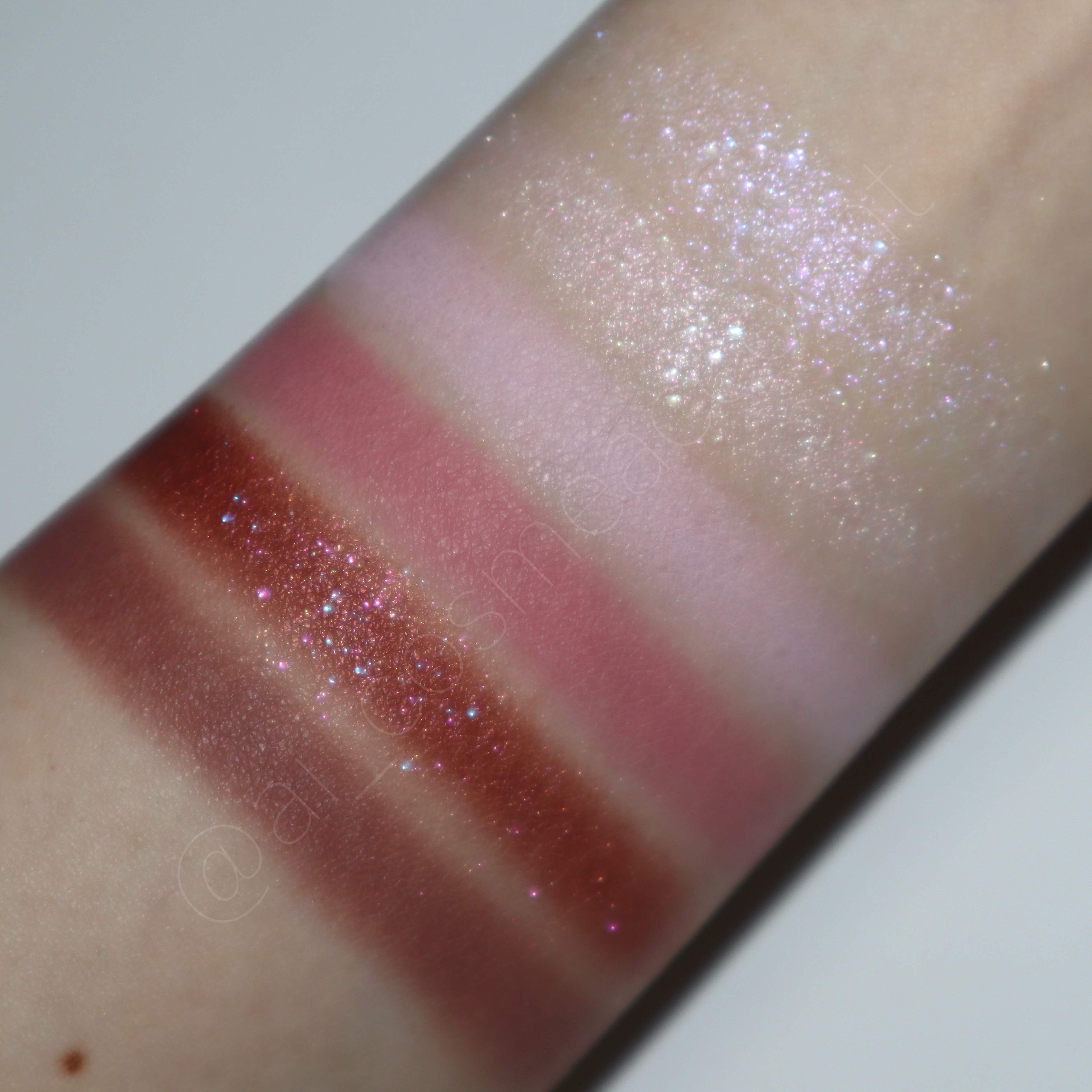 S[SHINY]“高輝度ガラスパール×カラーパールの美しいきらめき”↓S01.ピュアブロンズ“上品に艶めくブロンズゴールド” R[RICH]“リッチな高発色と繊細なツヤで色遊びを楽しめる”↓R01.バニラムスク“光を集めるハイライトベージュ” F[FLUFFY]“ふんわり・しっとりの新感覚 肌と同化するセミマット”↓F01.ラストナイト“血色感を潜ませるメロウなピンク”