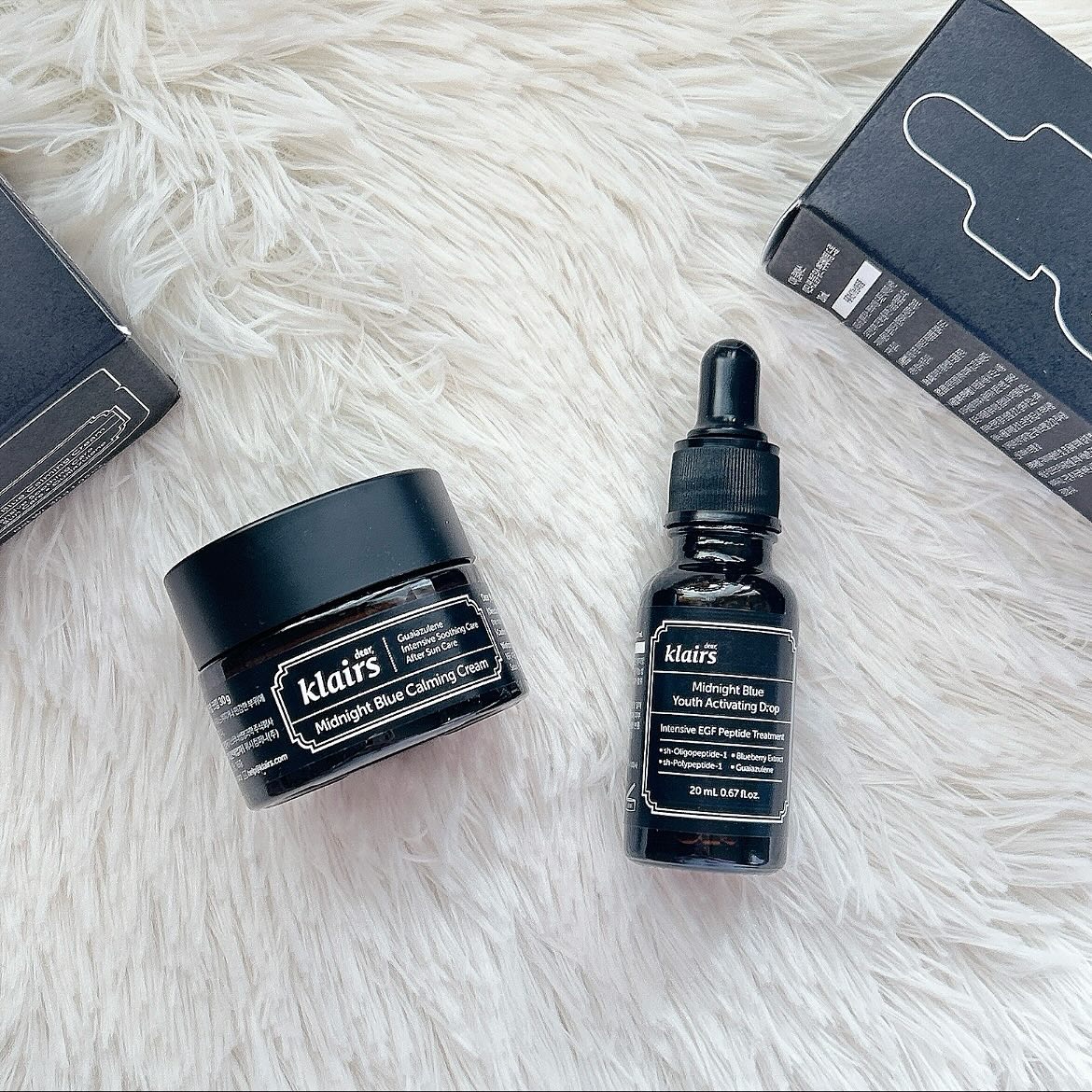 **Klairs様(@klairs.jp)より・ミッドナイトブルードロップ・ミッドナイトブルーカーミングクリームのご提供頂きました🧸𖤐⡱﹏﹏﹏﹏﹏﹏﹏﹏﹏﹏﹏﹏﹏﹏﹏﹏﹏〈ミッドナイトブルードロップ〉グアイアズレンとEGF、bEGFを高濃度で...