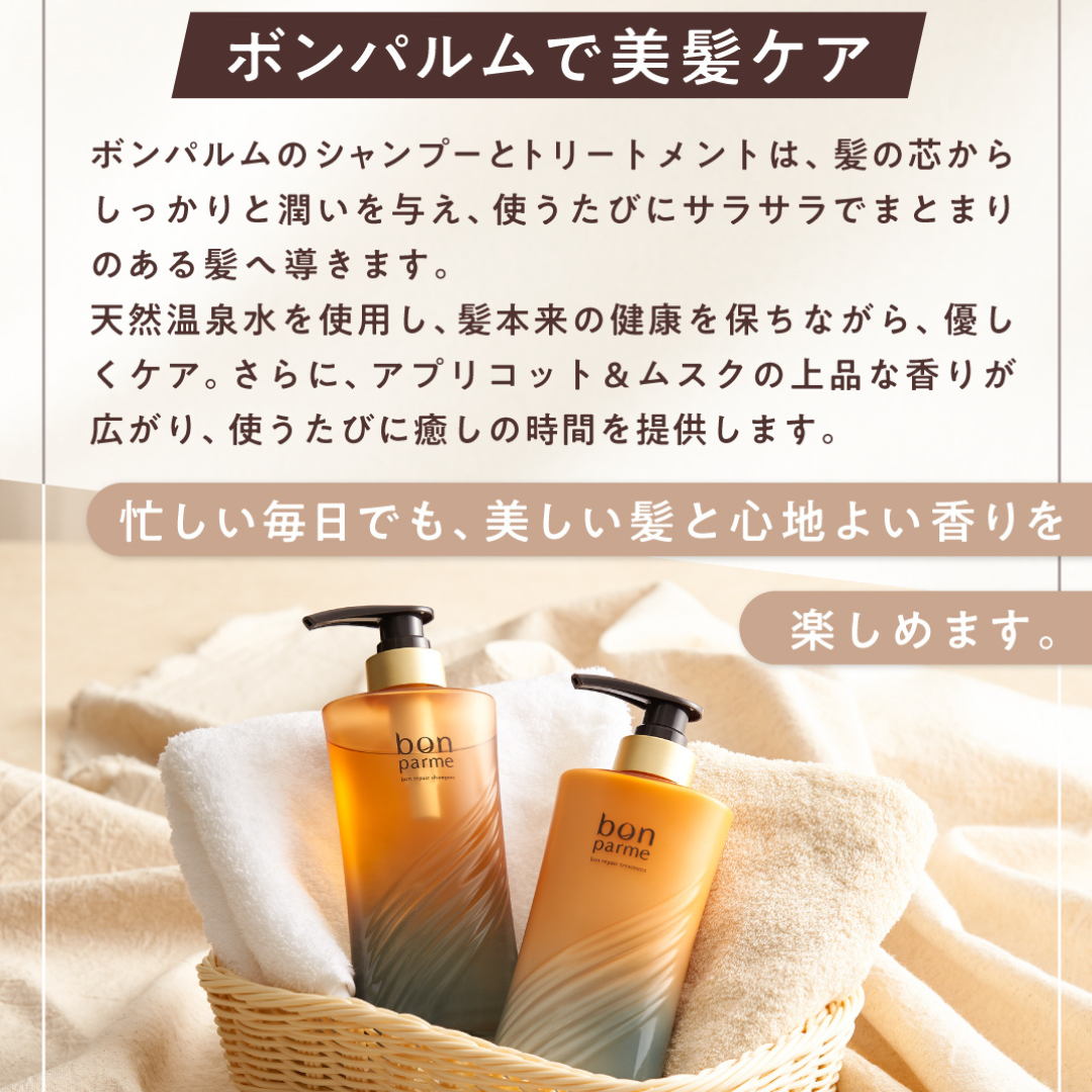 - ダメージも、うねりも、”素直”にするんっ! 毎日のバスタイムで”ととのう”シャンプートリートメント 【アプリコット&ムスクの香り】 ”ととのう”カギは温泉水とテクノロジー するんと指通りが良く、まとまりのある髪でいるためには、キューティクルのケアが必要不可欠。 キューティクルが開いた状態ではせっかくうるおいを与えても逃げてしまい、ダメージは改善しないまま。 ボンパルムではベースの水からパワーを持たせワンランク上のヘアケアを行うために、温泉水に着目しました。 ボンパルム専用の温泉水に美容テクノロジーをかけ合わせ、キューティクルを引き締め、髪の中でうるおいが育まれる環境を作り出します。 ◆セレクト温泉水『シリカ酸性泉』 髪の主成分「ケラチン」の生成を助けるミネラル『シリカ』に、 キューティクルを引き締めてうるおいの流出を防ぐ「酸性泉」を合わせたセレクト温泉水です。 頭皮や髪の傷み、血流不足による抜け毛や白髪などを幅広くケアします。 ◆洗浄と髪の修復にはたらく『美容テクノロジー』 「レチノール」や「アゼライン酸」、「ナイアシンアミド」など 美容クリニックでも使用されるエイジングケア*成分を配合することで頭皮環境をととのえ、 「PPT」や「ヘマチン」など髪のうねりを補正する成分も多数配合しました。 *年齢に応じたケア