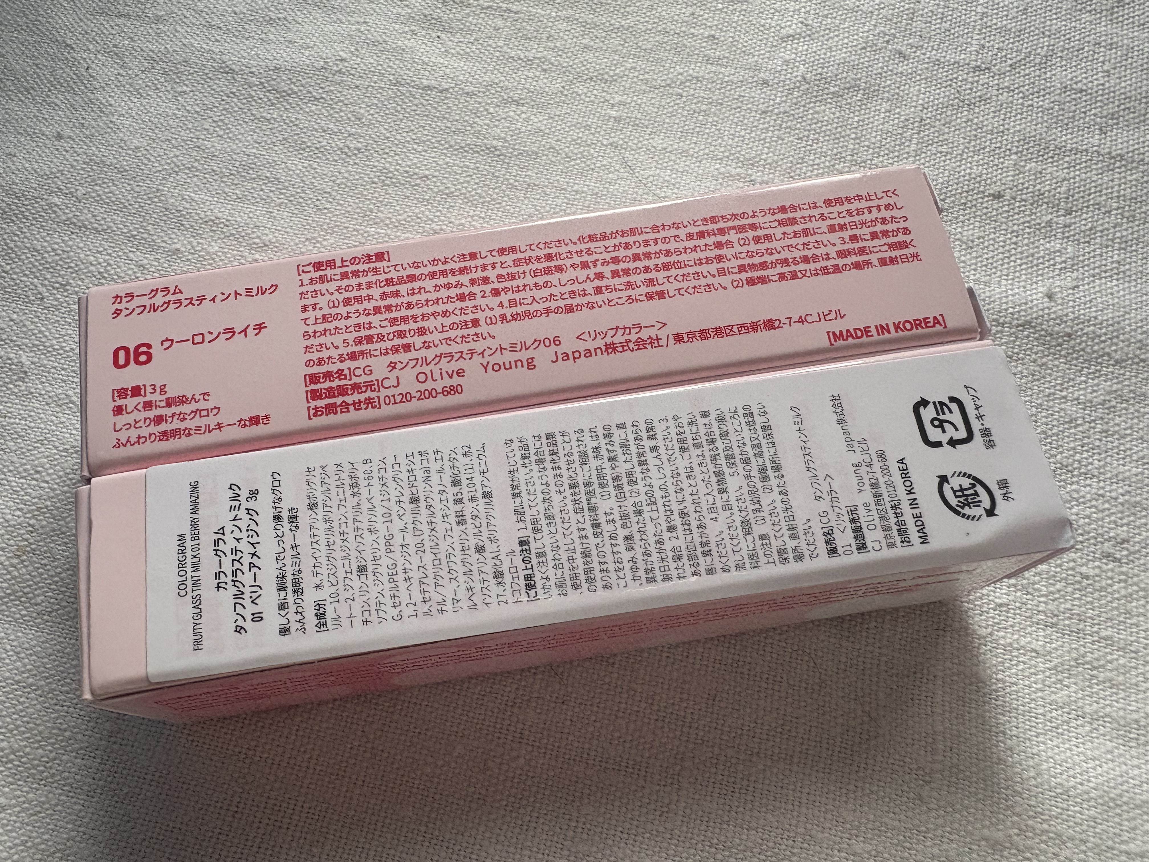 LIPS様を通してColorgram様からプレゼントしていただきました!タンフルグラスティントミルク1号ベリーアメイジングピュアなピンクであざと可愛さUP◎6号ウーロンライチ落ち着いたカラーリングで大人っぽい印象に。見えるカラーそのまま唇に綺...