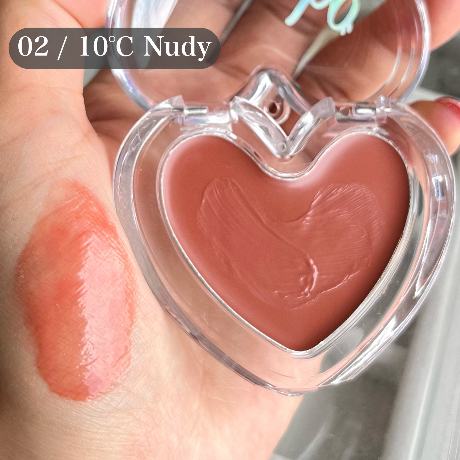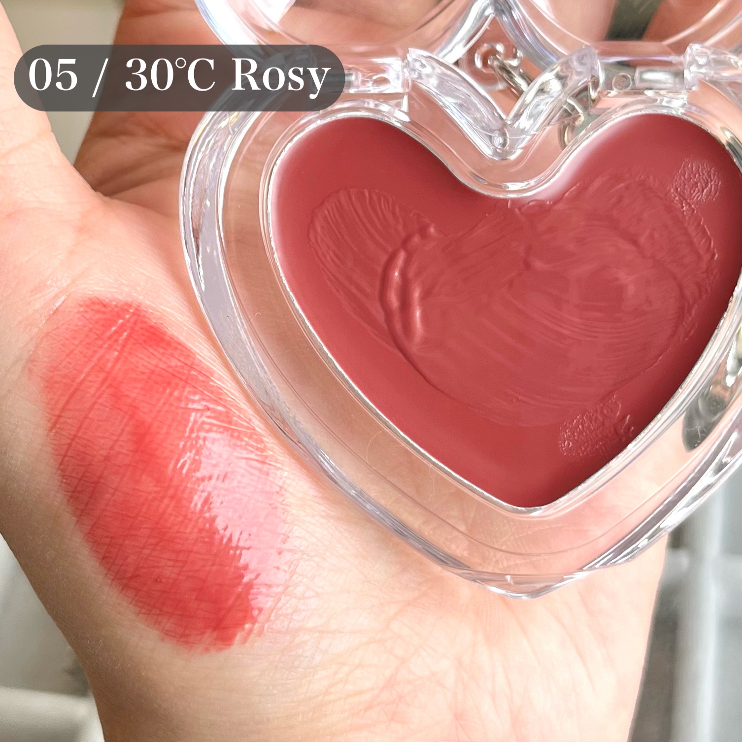キボハートキーリングリップ&チークとハートリップ&チークシリコンブラシ🩷とにかく見た目が可愛すぎるコスメ😍付属でキーリングが付いてるから持ち運びにも便利だよ。カラーは5色あり、今回試してみたのは0210℃Nudyと0530℃Rosy🩷早速唇に...