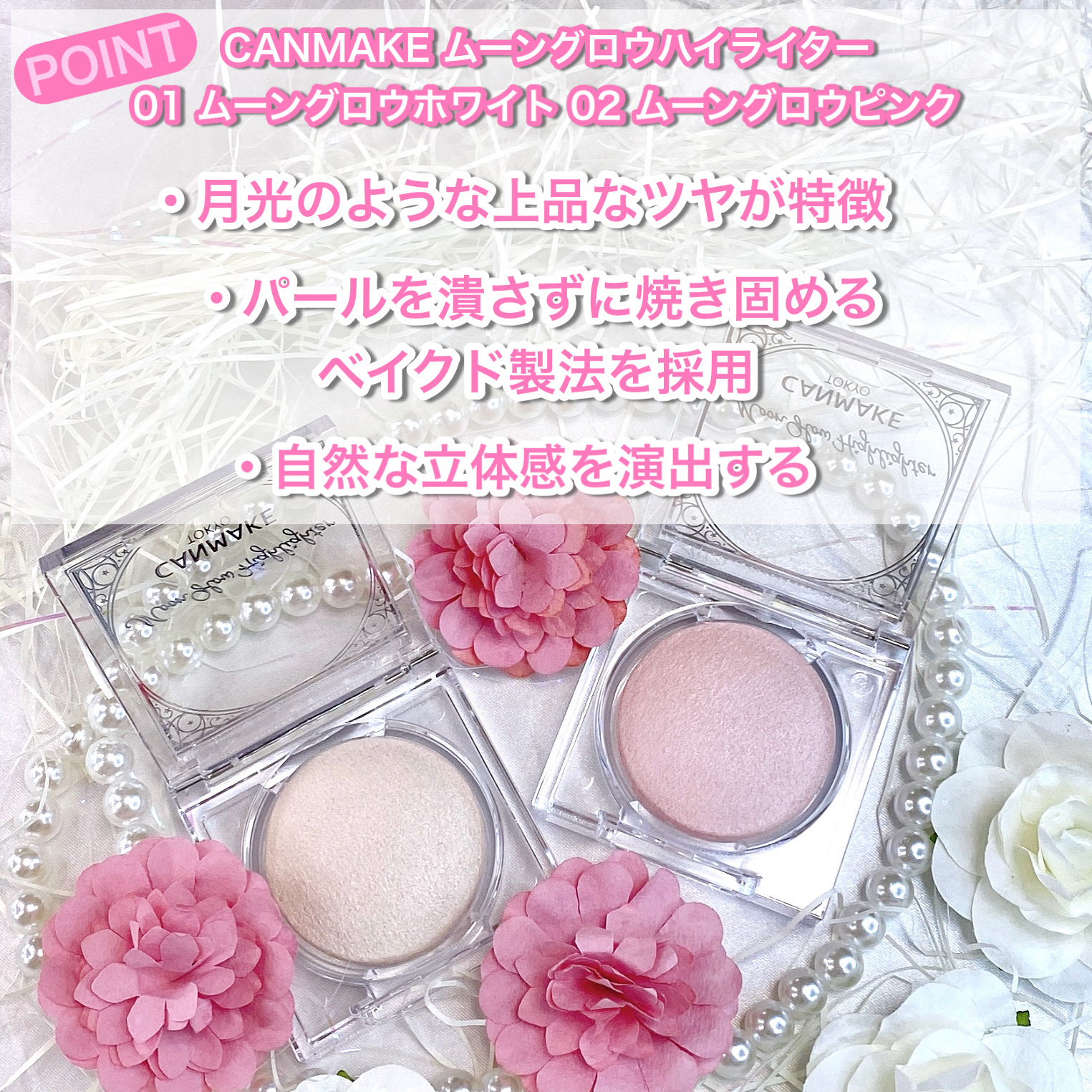 - 月光のような上品つやで立体感🌕 ベイクド製法のハイライター✨ パールを潰さずに焼き固める事で、 パールの輝きを活かせるベイクド製法を採用。 繊細パールを高配合。面で光り輝いているような仕上がりに。 上品な華やかさと自然な立体感を演出します。