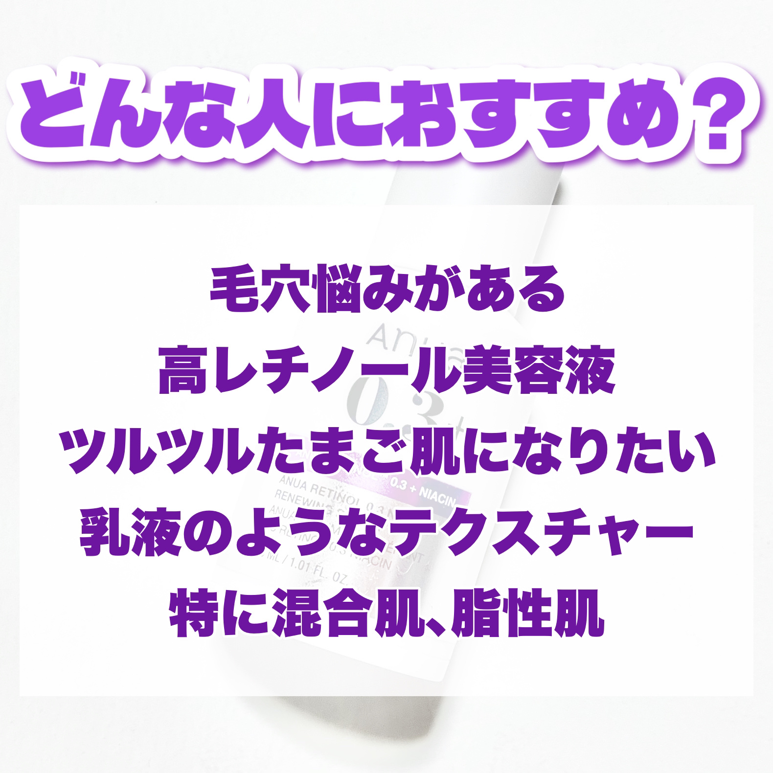 【徹底比較】アヌアの美容液どれがいいの?【Anua】レチノール0.3ナイアシンリニューイングセラム容量:30ml価格:3200円ダークスポットセラム容量:30ml価格:2800円アゼライン酸15インテンスカーミングセラム容量:30ml価格:2...