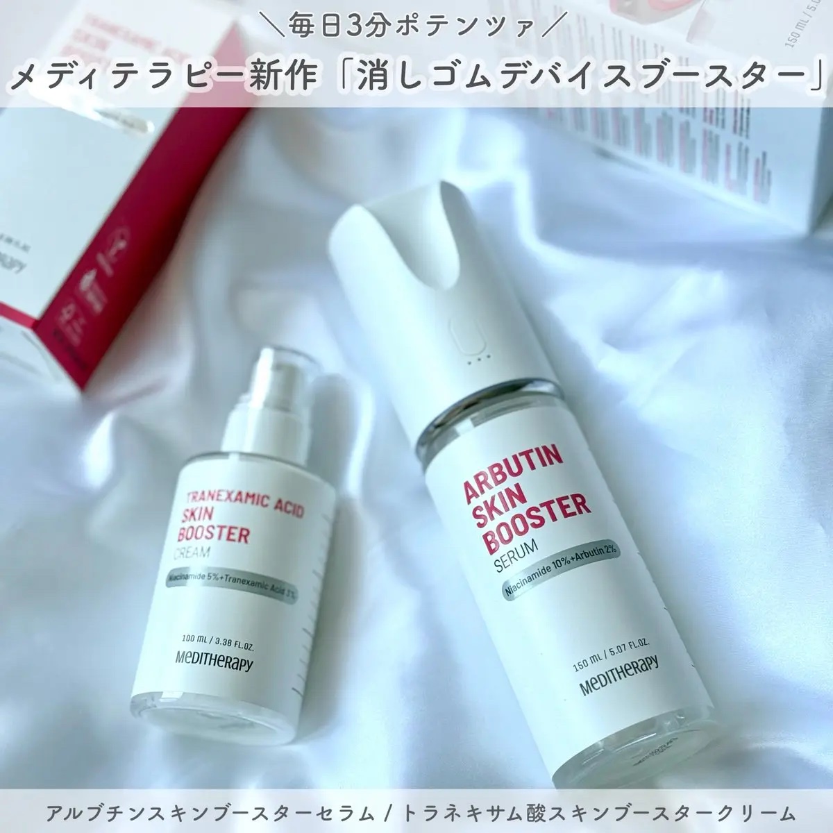 メディテラピー𓊆アルブチンスキンブースターセラム/トラネキサム酸スキンブースタークリーム𓊇 『毎日3分ポテンツァ』として出た新作🆕✨️『シミ消しデバイスブースター』ことナイアシンアミド10%+アルブチン2%配合の高濃縮セラムを1週間使ったら、...