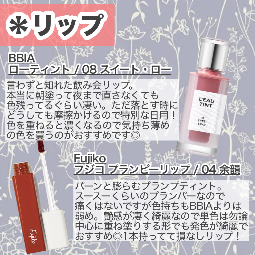飲み会リップの新色レポ!*BBIAローティント/08スイート・ロー¥1,600飲み会リップといえばBBIAですが、唇弱弱芸人なので使ったことがなく今回初めて試してみました!結論、思ったより唇は荒れなかった(!)流石に丸一日付けてると夜は乾燥か...