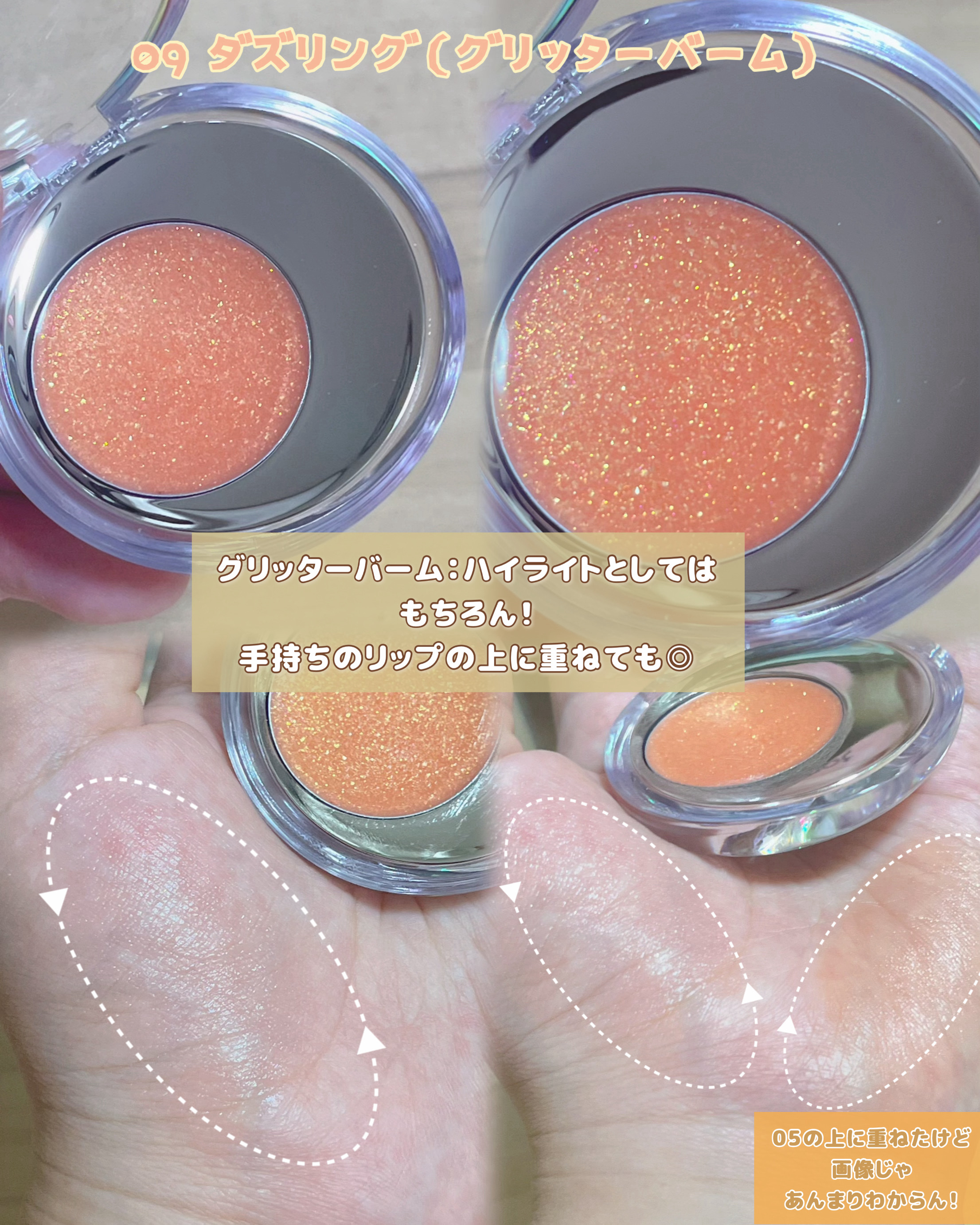 全商品が手のひらサイズのミニサイズコスメ♡ 持ち運びも便利でありながら 今、流行のバレエコア🩰のような リボンモチーフがとっても可愛らしくて 購入せざるを得ませんでした。笑 驚いたのが発色の良さ。 ②と④のカラーが一見使いづらいかな?と思うカラーですが、全然そんなことはなく みんな大好きなピンクグリッター。 ピンクベースの中に多色のラメがちらちらと 配合されていて、これがほんっとうに可愛い。