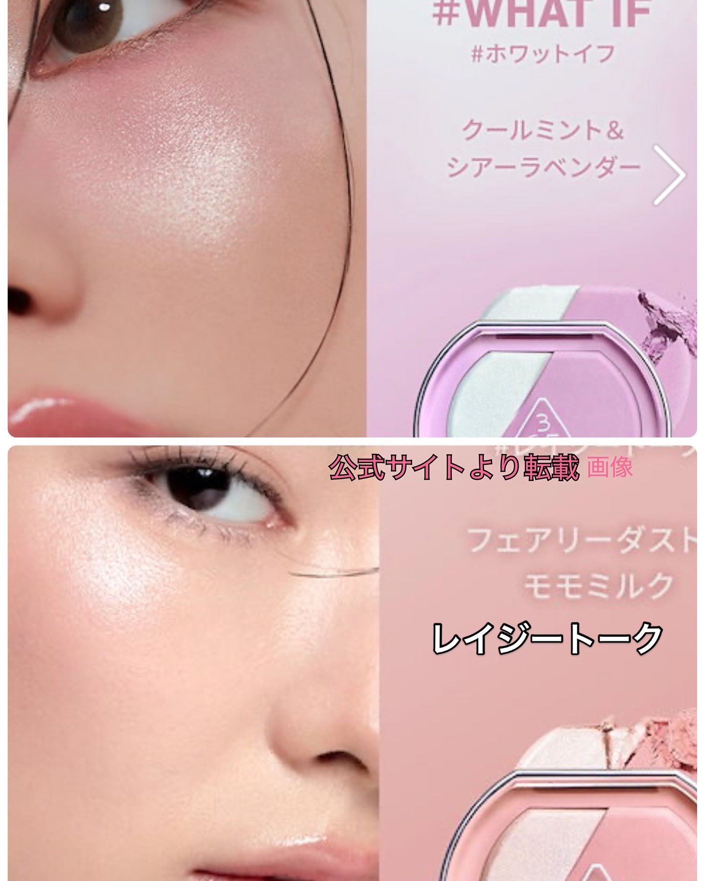 3CEのカラーへのこだわりを詰め込んだチーク&ハイライト新発売 色相環に基づいた配色で、チークとハイライトのベストバランスを実現 見た目よりもナチュラルな発色で、どのカラーも使いやすく感じました!! フワッと柔らかい質感でふんわりとした雰囲気のほっぺに仕上げてくれます♪