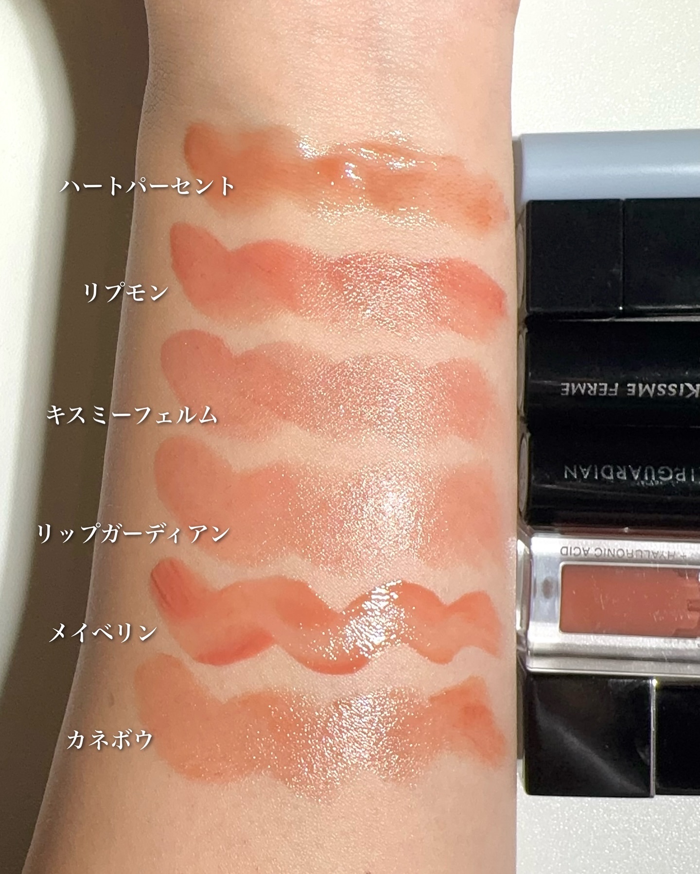 ねっちょりボリューム感あるテクスチャーだけど、ベタつきなく使いやすい。 ティントじゃない普通のグロスだから色もちは良くない。 発色ナチュラルだからこれだけでもいいけど、他のリップと合わせても可愛い!!