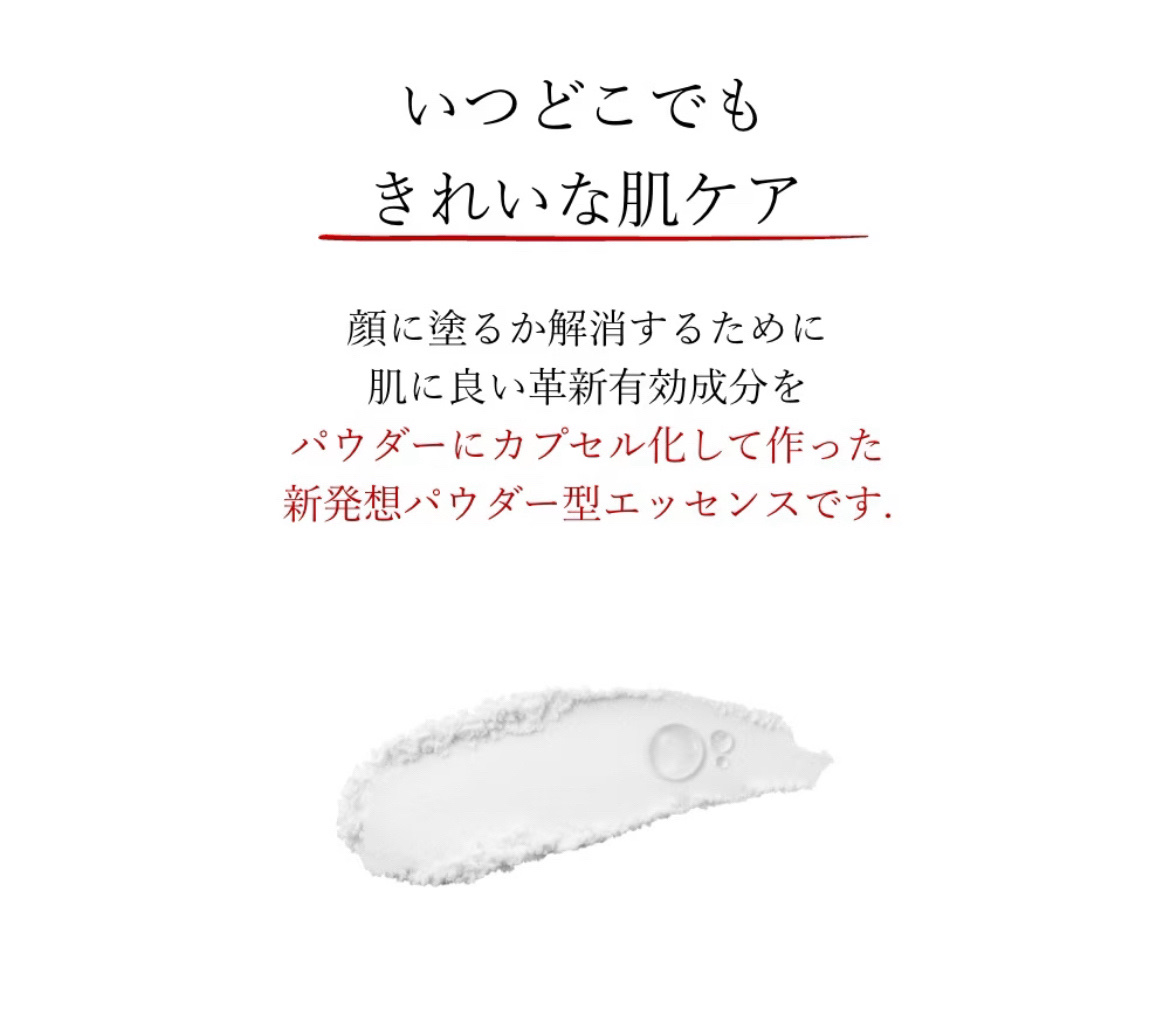 - パウダーを塗った瞬間エッセンスに変わり、すぐになじむ新概念パウダー 美容液なのにパウダー?! 不思議な感覚のマイクロバイオームバリアエッセンス Point1:8つの機能を持つ微細粒子で構成された“新感覚パウダー” Point2:塗った瞬間、美容エッセンスに変化し、しっとりフワフワな肌質に Point3:お肌を冷却&テカリを抑えてくれるため、朝のベースメイク前に最適!