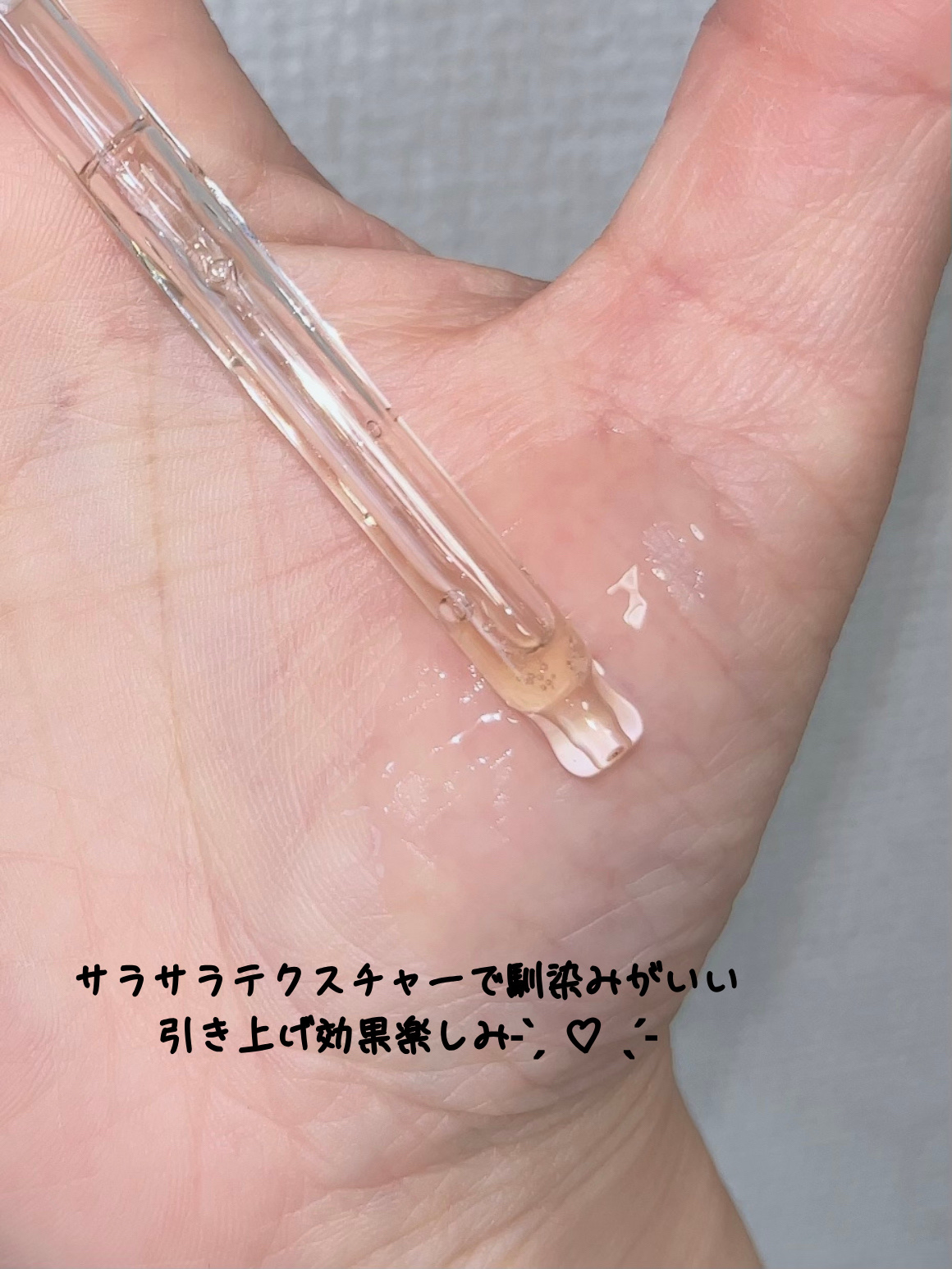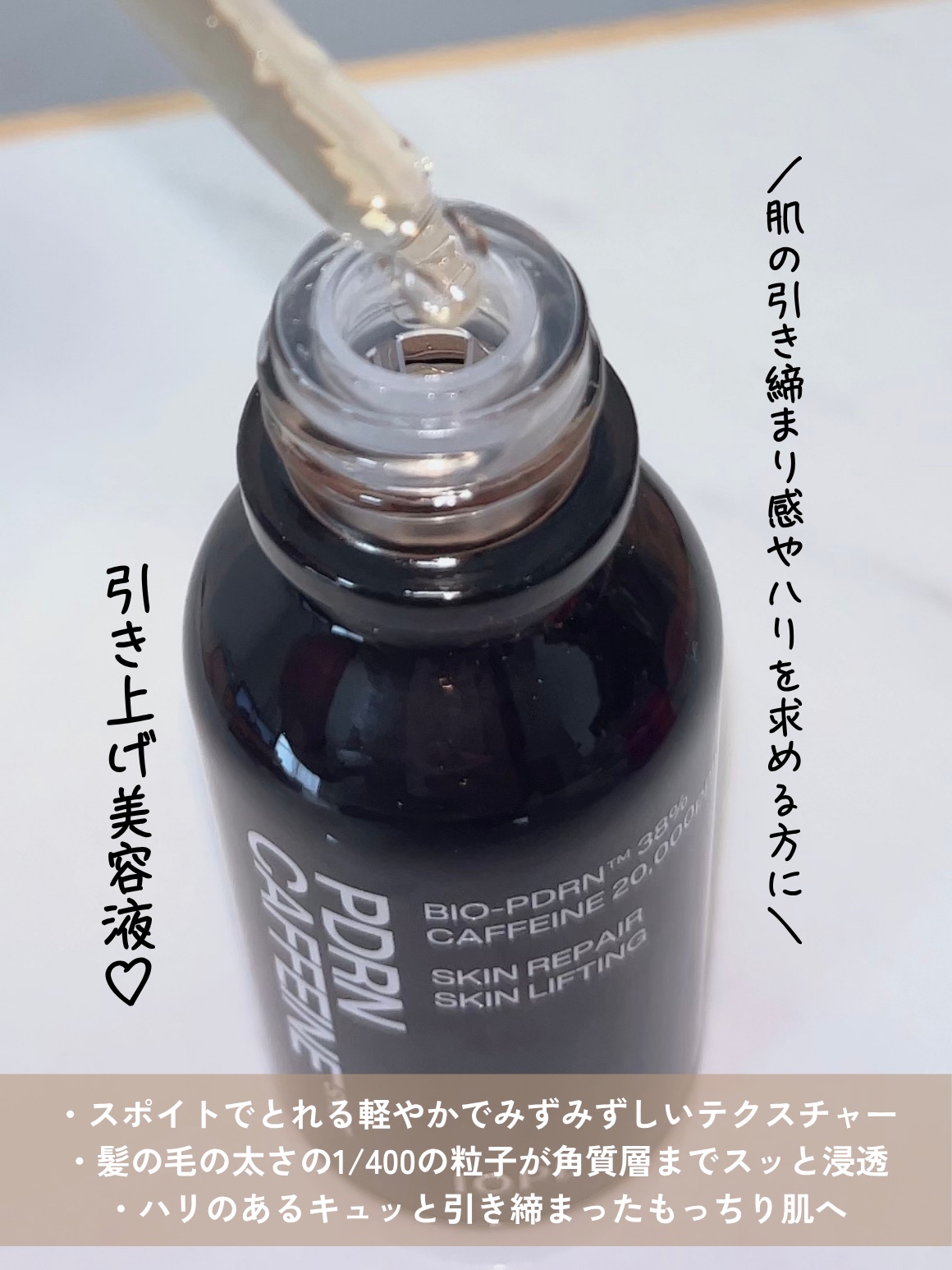 強力なリフトアップ成分スキンカフェイン™、スキンカフェイン™Mが配合されているそうで肌をキュッと引き締め、フェイスラインと口角を引き上げてくれます✨ 髪の毛の太さの1/400サイズの粒子が肌にスッと浸透してくれるのでほんっとにお肌がすべすべになります、、😭 みずみずしいテクスチャーで軽やかな使用感なので使いやすいです🙆♀️