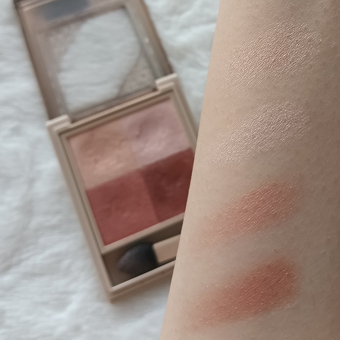 - ● しっとりほぐれるようなタッチで密着し、上品なツヤめきと透け感発色で目もとを彩る 4 色セットアイカラーです。 やさしいトーンの色味と繊細な輝きで、どこか儚げでアンニュイな印象に導きます。 ● レフ板のように光を美しく反射させるライトリフレクションパウダーを配合。 どの角度から見ても、繊細な輝きと濡れたようなツヤを演出します。 ● 透け感があり、軽いタッチでのび広がるクリアパウダーを配合。 色味を重ねても濁りのない透け感発色を叶えます。 ● とてもキメ細かなパウダーに厳選したオイルを組み合わせることで、しっとりなめらかなほぐれ感を実現。 薄膜にのび広がり、まぶたへ溶け込むように密着します。 ● スルスルとした軽い感触のオイルを配合。摩擦抵抗を減らすことで、まばたきや表情の変化によるヨレを防ぎます。 汗や皮脂にもくすみにくいため、時間が経ってもつけたての美しい発色が持続します。 ● まぶたに明るさをあたえ、後から重ねるアイカラーを美しく発色させる「スキンブライトカラー」(A)をセット。 光を味方につけてまぶたのくすみを飛ばし、明るくツヤめく目もとを叶えます。 ● 色ごとに仕切りがないため、1 色ずつはもちろん、パレット内で色を混ぜて塗布することもできます。 ● 美容液成分配合。乾燥しやすい目もとのうるおいをまもります。 ● 無香料