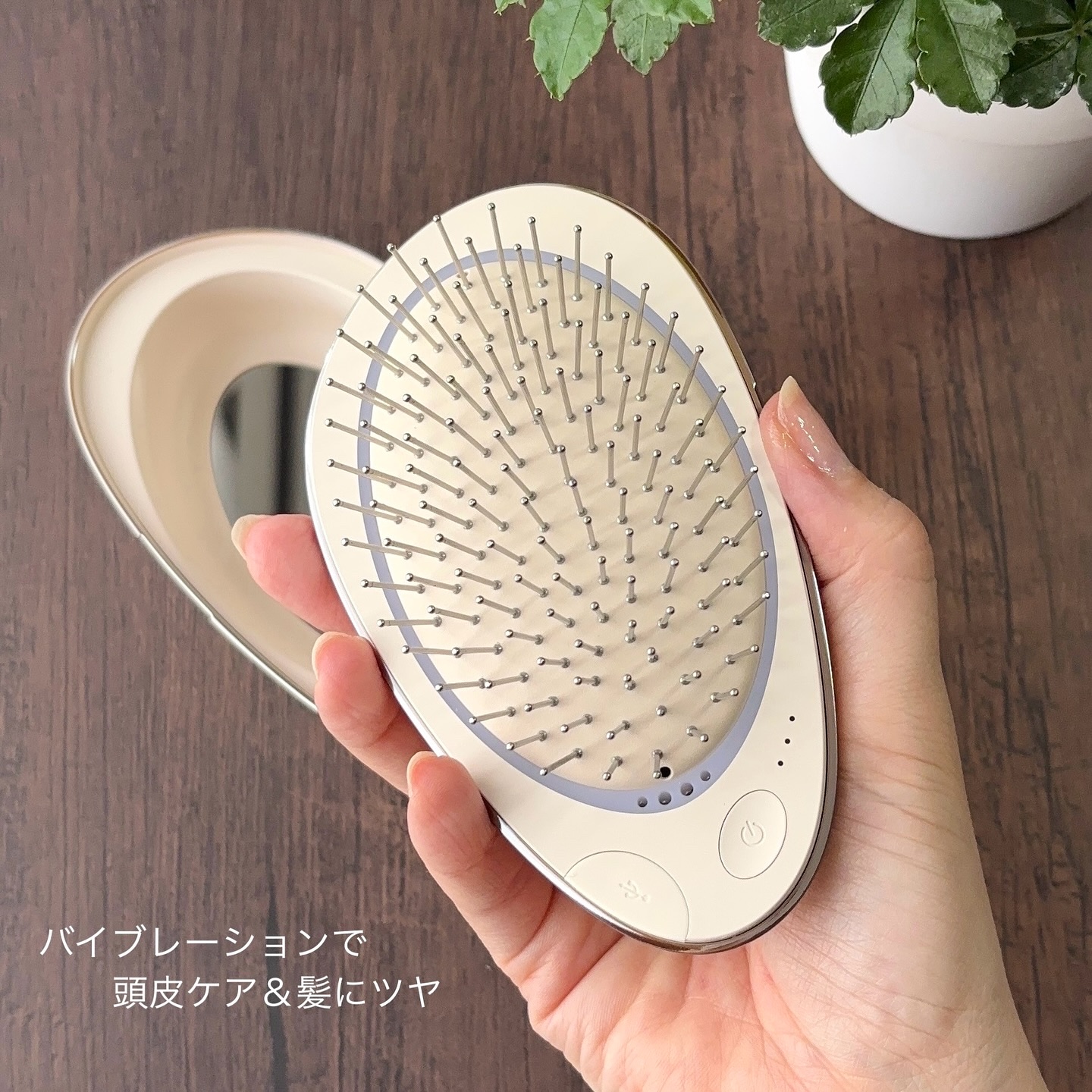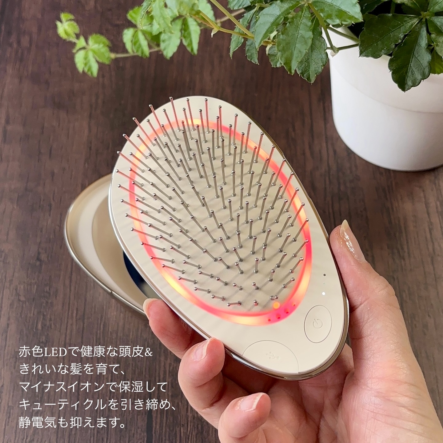 - 「EMS Brush Air mini」はピンクゴールド・ゴールド・ホワイトの3色展開。上品な光沢感とカラーリングが特徴で大切な方へのギフトや自分へのご褒美にもおすすめです。ケース内側に配されたミラーを使えばいつでもどこでも、気軽に本格ケアを堪能でき、旅行やご出張などが多い方にもおすすめのアイテムです。 [ 機能① 『EMS』で理想のフェイスラインへ ] 周波数の異なる2つの刺激を交互に送り出すことで、広域に均等に伝わる独自のEMSとマイクロカレント。やわらかなクッションと柔軟性のあるピンのおかげで、心地よい刺激が、広い範囲にやさしく、じんわりと伝わり、頭皮のリフトケアへと繋がります。 [ 機能② 『マイナスイオン』であこがれの艶髪へ ] 水分子に包まれたマイナスイオンが、髪表面を潤いでコーティング。保湿効果を高め、キューティクルを引き締めます。マイナスイオンが浸透すると、髪をなめらかにし、嫌な静電気も抑えます。 [ 機能③ 『赤色LED』で頭皮を元気に! ] 赤色LEDは頭皮への刺激が少なく、やさしいケアとして人気。すこやかな頭皮や髪を育てる環境づくりに役立ちます。頭皮のめぐりをよくすると共に、EMSと併せて使用することで、本格的なエステ効果が期待できます。 [ 機能④ 美容ケアの総合力を上げるバイブレーション ] 今回登場した「EMS Brush Air mini」は上記3つの機能をより深く、効果的に浸透させるための『バイブレーション機能』を追加しました。1分間5200回の細かな振動回数で、肌や筋肉をやさしくケアしながら、髪の絡まりもほぐしていきます。