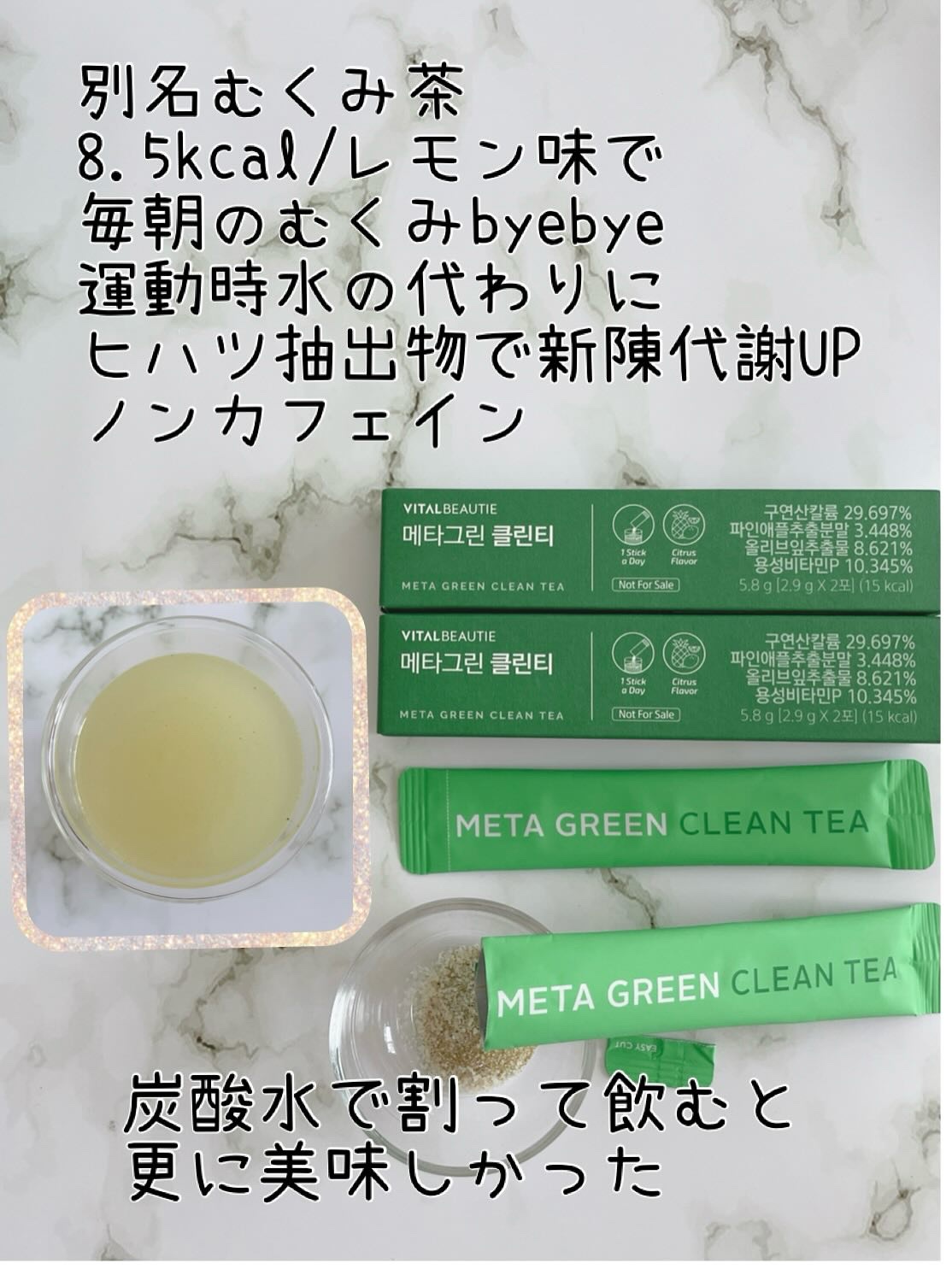 VITALBEAUTIEメタグリーンライン🍀🟢メタグリーンクリーンティー新発売のクリーンティーはサッと水に溶けて爽やかなレモン味でゴクゴク飲める!🍵クリーンティーも味が美味しいから続けやすそう✊🏻むくみが気になる日の朝に飲んでるよ!持ち運びし...