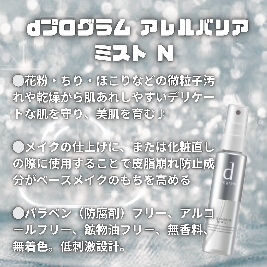 この時期本当にこれは使って良かった!花粉症時期昨年はピリつくし乾燥に肌荒れが酷くすごく悩んでました🥲このdプログラムアレルバリアミストN使ってからだいぶ辛い花粉症も軽減😭容量・価格57ml¥1,650サイズ感は手のひらくらいのコンパクトサイズ...