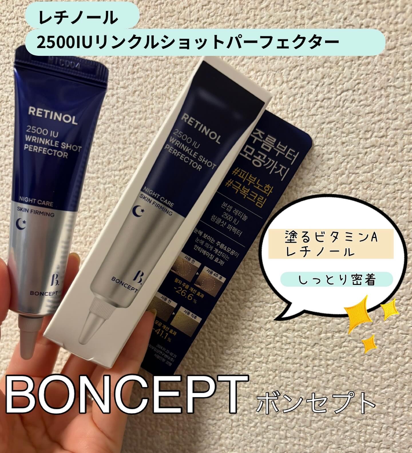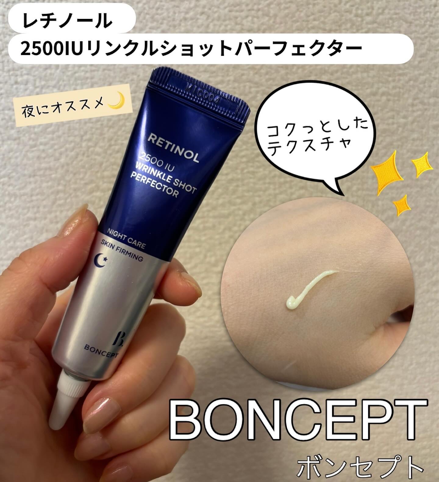 .✾BONCEPT レチノール2500IUリンクルショットパーフェクター15ml..シワ改善と肌のハリ向上に役立つ優れもの✨.ベタつかずに肌にフィットし弾力感と栄養感を与えるなめらかなクリームのテクスチャー☝🏻.使った後の肌が弾むような感じが...