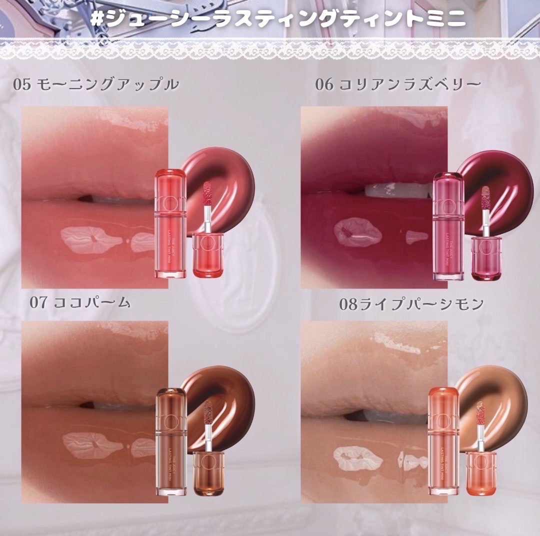 - ・全角度から分析とブラインドテストまで! 色味はもちろん、塗り心地、色もち、ツヤ感、仕上がりイメージなど様々な角度から比較分析とブラインドテストを経て作られました ・新しく誕生したザジューシー ! ジューシーラスティングティントでおなじみのツヤ感カラーはそのままで発色と持続力がさらにアップすることを実現しました ・クリアな光沢感 砂糖をコーティングしたような透き通るNEW光沢で輝く唇に ・全世界で愛されている JUICY LASTING TINTがリニューアル! ツヤ感UP・色もちUP!全てにおいてアップグレードされたことに加えて、果実を連想させる多彩なカラーバリエーションも注目ポイントです ・色だけじゃない!保湿も同時に 10種のヒアルロン酸(*)を配合 唇をしっとりと潤わせながら乾燥から守ります ・長時間ぷっくり仕上げをキープ 時間が経つにつれ、唇に密着!唇のしわをしっかりカバーしてくれます (*)ヒアルロン酸ジメチルシラノール、加水分解ヒアルロン酸、加水分解ヒアルロン酸Na、ヒアルロン酸、ヒアルロン酸K、ヒアルロン酸Na、ヒアルロン酸ヒドロキシプロピルトリモニウム、ヒアルロン酸クロスポリマーNa、ヒアルロン酸ジメチルシラノールNa、アセチルヒアルロン酸Na(すべて保湿成分) 2025年7月19日(土)(※1)より順次、全国のバラエティショップ・GMS・アインズ&トルペにて(※2)数量限定で発売します。 (※1)店頭開始日となり、購入可能日は各店舗によって異なります (※2) 一部店舗では取り扱いがない場合があります。