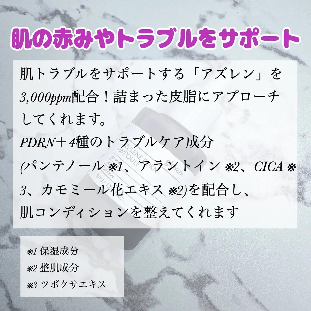 Glow.MアズレンPDRNアンプルバリア・ニキビ跡・皮脂・毛穴・トラブル集中ケアアズレイン3,000ppmサーモンPDRNパンテノールシカカモミール花エキス天然の濃い紫色がすごい!セラムのような軽いテクスチャー#PR...