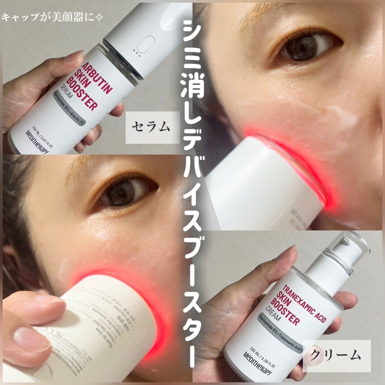 メディテラピーの新作「毎日3分ポテンツァ」❤︎アルブチンスキンブースターセラムトラネキサム酸スキンブースタークリームキャップがEPデバイスになっている新感覚の美顔器…!悩んでいたニキビ跡やくすみに効果がある印象で、肌が全体的に明るくなってきた...