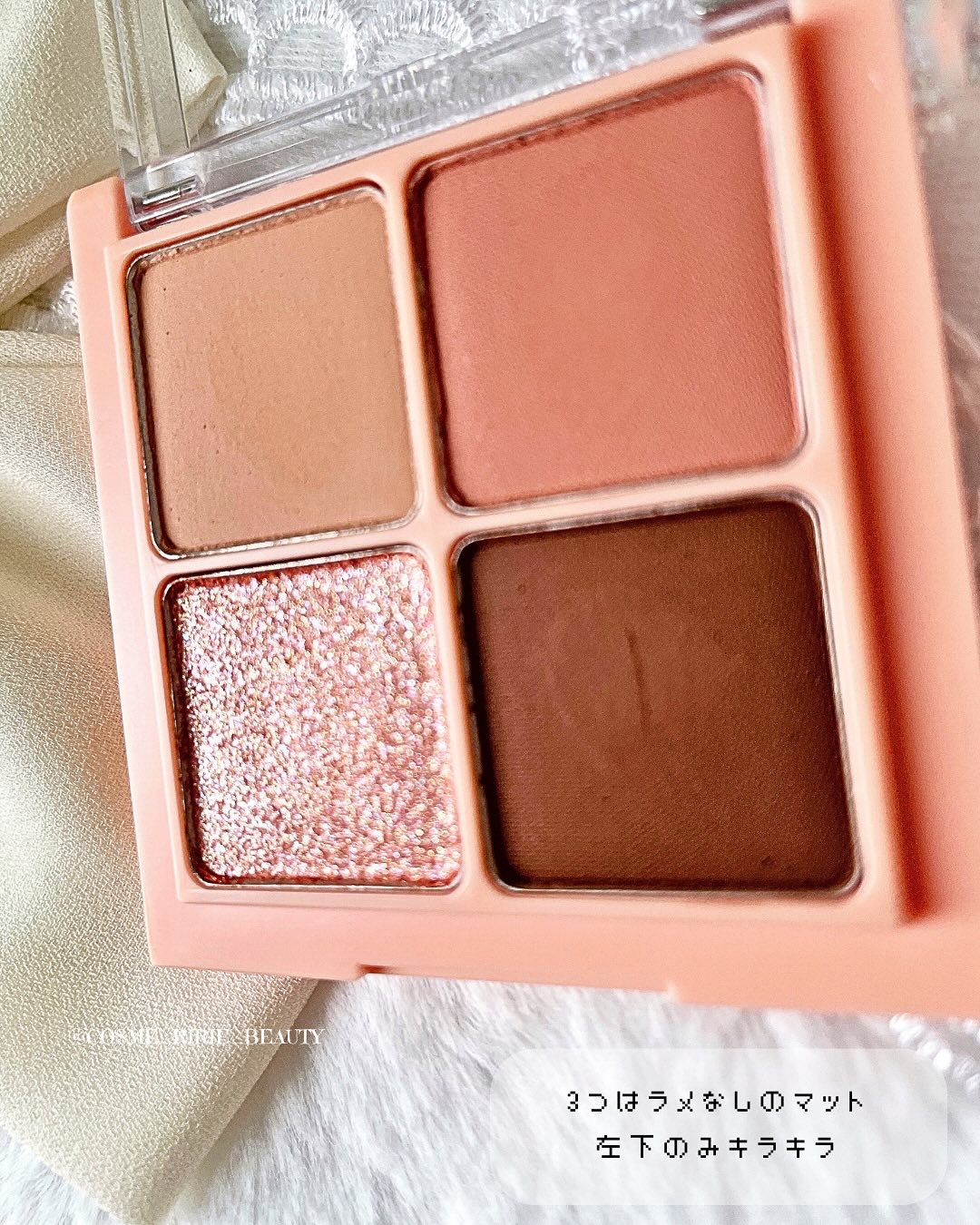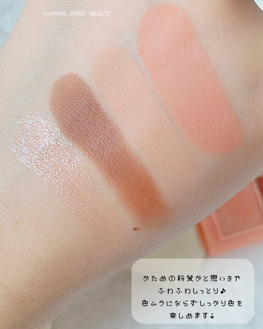 右側はぷにっとした柔らかな質感で、繊細な偏光ラメがちらちらと輝きます。 左側はふわさらな粉質のマットで、グラデーションをつけるとふんわり甘い印象に。 肌なじみが良くて使いやすいのがうれしい🩷