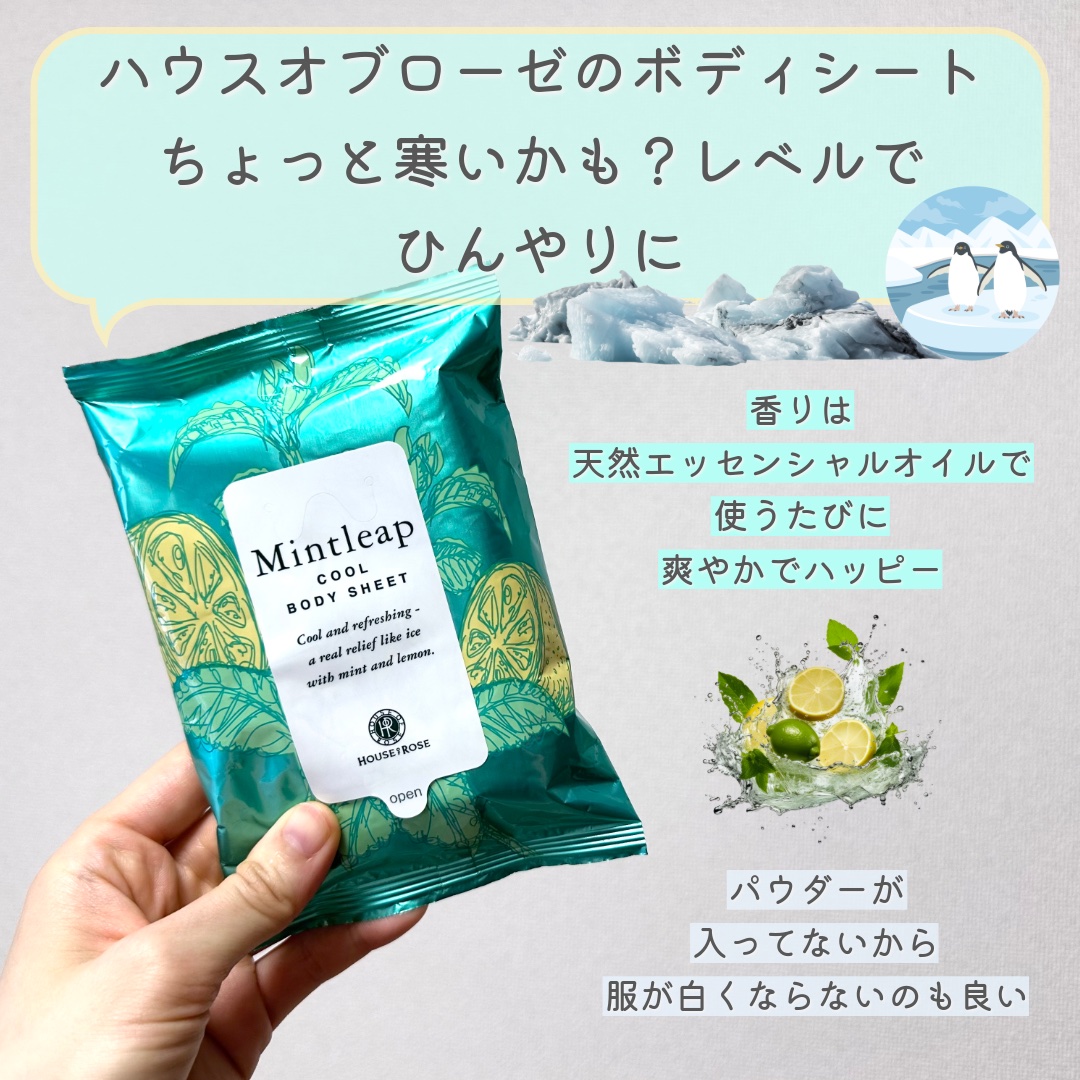 - 【期間・数量限定】 頭皮や体をシャキッとクールに、ベタつくお肌をさらさらに整える 『ミントリープ』 が今年も登場! ミントやバジルを基調にレモンやユーカリなど、9種の天然精油をブレンドした清々しい香りが夏にぴったり。 使った瞬間に感じるクール感と、持続するクール感のダブルの効果で、清涼感あふれる心地よさを体感。 ハウス オブ ローゼオリジナルのレモン果実エキス(保湿成分)配合です。 バスタイムや外出先など様々なシーンでクールにリフレッシュできる『ミントリープ』で、暑い夏を快適にお過ごしください 天然素材のやわらかな大判シートに、クール感のある化粧水をたっぷり含有。 使用後は、まるでシャワーを浴びた後のような爽快感! シートのメッシュ構造が、肌表面の汗、汚れや臭いのもとをやさしくかき取り、ベタつきを防ぐ効果もあります。 無香料(天然精油の香り)・無着色・無鉱物油・パラベンフリー