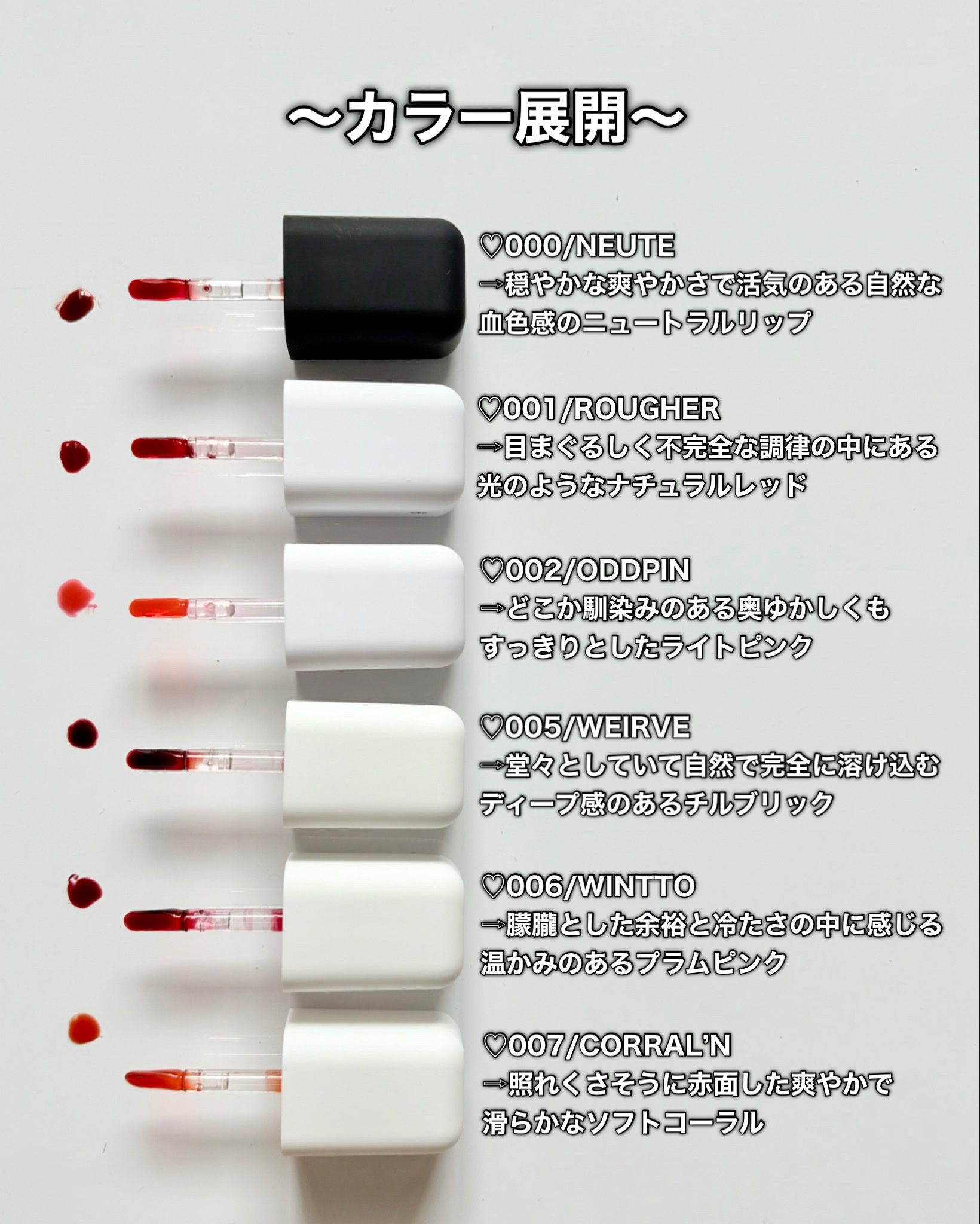 - <000 NEUTE> 水、ポリビニルアルコール、1,2-ヘキサンジオール、DPG、エタノール、カラメル、クエン酸、クエン酸Na、ペンチレングリコール、香料、BG、アラントイン、黄5、グリチルリチン酸2K、黄4、赤227、赤218、赤223、青1、ヒアルロン酸Na、アテロコラーゲン、デサミドコラーゲン、加水分解コラーゲン、水溶性コラーゲン、加水分解ヒアルロン酸、コラーゲン、コラーゲンアミノ酸、アセチルヒアルロン酸Na、プロコラーゲン、ローズケトン <001 ROUGHER> 精製水、ポリビニルアルコール、ダイプロピレングリコール、1、2-ヘキサンジオール、エタノール、クエン酸、ソジウムシトレート、ペンチレングリコール、橙色205号、香料、赤色227号、ブチレングリコール、黄色5号、バニリルブチル、酢酸ナトリウム、アラントイン、赤色223号、グリチルリチン酸2K、赤色218号、ソジウムハイアルロネート、アテロコラーゲン、デサミドコラーゲン、ハイドロライズドコラーゲン、水溶性コラーゲン、加水分解ヒアルロン酸、コラーゲン、コラーゲンアミノ酸、プロコラーゲン、ソジウムアセチルレイテッドハイアルロン酸塩 <002 ODDPIN> 精製水、ポリビニルアルコール、ダイプロピレングリコール、1,2-ヘキサンジオール、エタノール、クエン酸、ソジウムシトレート、ペンチレングリコール、香料、ブチレングリコール、赤色223号、バニリルブチル、酢酸ナトリウム、アラントイン、グリチルリチン酸2K、橙色205号、赤色227号、赤色218号、ソジウムハイアルロネート、アテロコラーゲン、デサミドコラーゲン、ハイドロライズドコラーゲン、水溶性コラーゲン、加水分解ヒアルロン酸、コラーゲン、コラーゲンアミノ酸、プロコラーゲン、ソジウムアセチルレイテッドハイアルロン酸塩 <003 BLUNTO> 精製水、ポリビニルアルコール、ダイプロピレングリコール、1、2-ヘキサンジオール、エタノール、クエン酸、ソジウムシトレート、ペンチレングリコール、橙色205号、香料、赤色218号、ブチレングリコール、赤色227号、バニリルブチル、酢酸ナトリウム、アラントイン、グリチルリチン酸2K、赤色223号、ソジウムハイアルロネート、アテロコラーゲン、デサミドコラーゲン、ハイドロライズドコラーゲン、水溶性コラーゲン、加水分解ヒアルロン酸、コラーゲン、コラーゲンアミノ酸、プロコラーゲン、ソジウムアセチルレイテッドハイアルロン酸塩 <004 ROSITE> 精製水、ポリビニルアルコール、ダイプロピレングリコール、1、2-ヘキサンジオール、エタノール、クエン酸、ソジウムシトレート、ペンチレングリコール、香料、ブチレングリコール、赤色223号、バニリルブチル、アラントイン、橙色205号、グリチルリチン酸2K、赤色218号、赤色227号、ソジウムハイアルロネート、アテロコラーゲン、デサミドコラーゲン、ハイドロライズドコラーゲン、水溶性コラーゲン、加水分解ヒアルロン酸、コラーゲン、コラーゲンアミノ酸、ソジウムアセチルレイテッドハイアルロン酸塩、プロコラーゲン <005 WEIRVE> 精製水、ポリビニルアルコール、1、2-ヘキサンジオール、ダイプロピレングリコール、エタノール、クエン酸、ソジウムシトレート、ペンチレングリコール、香料、ブチレングリコール、橙色205号、赤色227号、黄色5号、バニリルブチル、アラントイン、グリチルリチン酸2K、赤色223号、青色1号、赤色218号、ソジウムハイアルロネート、アテロコラーゲン、デサミドコラーゲン、ハイドロライズドコラーゲン、水溶性コラーゲン、加水分解ヒアルロン酸、コラーゲン、コラーゲンアミノ酸、ソジウムアセチルレイテッドハイアルロン酸塩、プロコラーゲン <006 WINTTO> 精製水、ポリビニルアルコール、ダイプロピレングリコール、1,2-ヘキサンジオール、エタノール、クエン酸、ソジウムシトレート、ペンチレングリコール、香料、赤色227号、ブチレングリコール、黄色4号、バニリルブチル、アラントイン、赤色218号、赤色223号、青色1号、ソジウムハイアルロネート、アテロコラーゲン、デサミドコラーゲン、ハイドロライズドコラーゲン、水溶性コラーゲン、加水分解ヒアルロン酸、コラーゲン、コラーゲンアミノ酸、ソジウムアセチルレイテッドハイアルロン酸塩、プロコラーゲン <007 CORRAL'N> 水、ポリビニルアルコール、1,2-ヘキサンジオール、エタノール、DPG、クエン酸、クエン酸Na、ペンチレングリコール、香料、BG、黄4、バニリルブチル、アラントイン、赤223、グリチルリチン酸2K、橙205、赤227、ヒアルロン酸Na、アテロコラーゲン、デサミドコラーゲン、加水分解コラーゲン、水溶性コラーゲン、加水分解ヒアルロン酸、コラーゲン、コラーゲンアミノ酸、アセチルヒアルロン酸Na、プロコラーゲン、ローズケトン <008 BROWYY> 水、ポリビニルアルコール、1,2-ヘキサンジオール、エタノール、クエン酸、クエン酸Na、DPG、カラメル、ペンチレングリコール、黄5、香料、BG、赤227、バニリルブチル、アラントイン、グリチルリチン酸2K、青1、赤218、赤223、ヒア