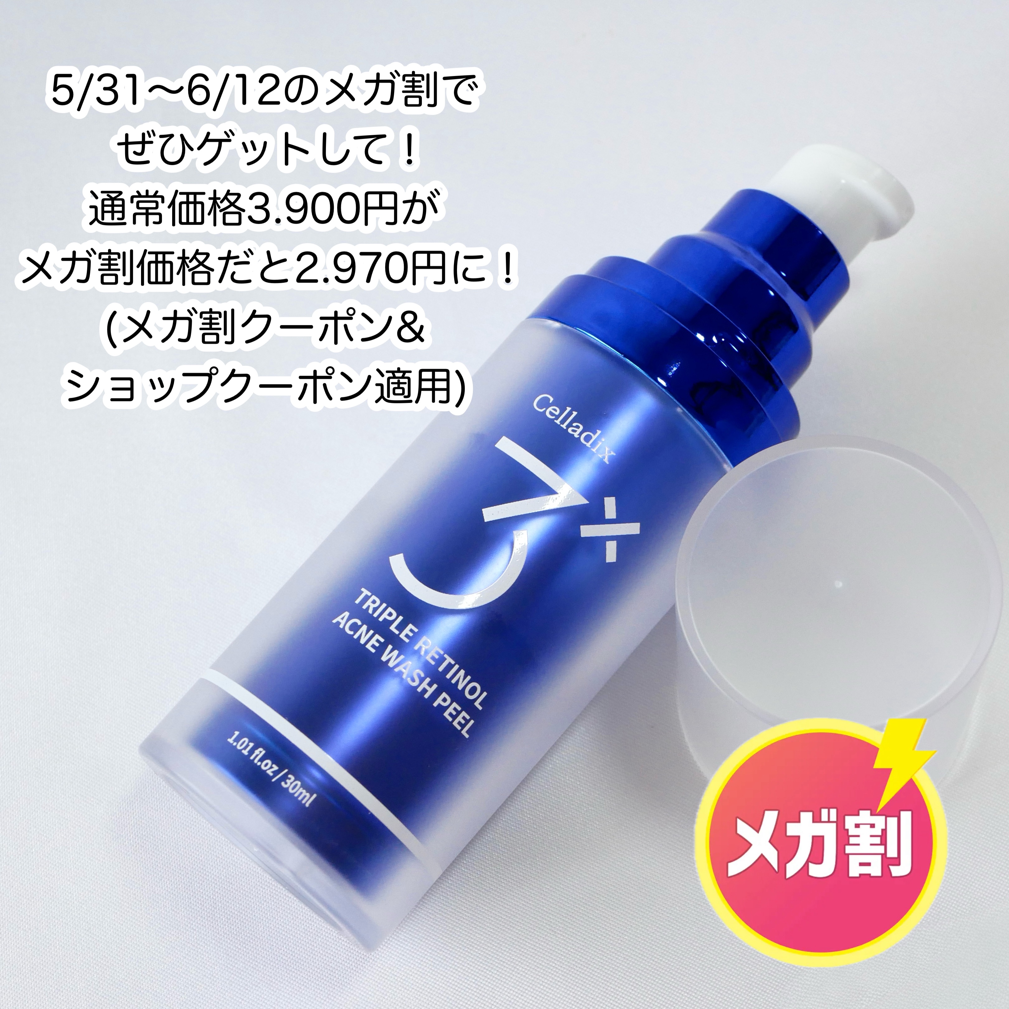 \話題の洗い流すレチノール美容液/Celladix(セラディックス)のトリプルレチノールウォッシュピールがQoo10メガ割で3,900円(税込)→2,970円(税込)になるよ!少し黄色みがかったとろっとしてテクスチャー。使い方は、洗顔後、乾い...