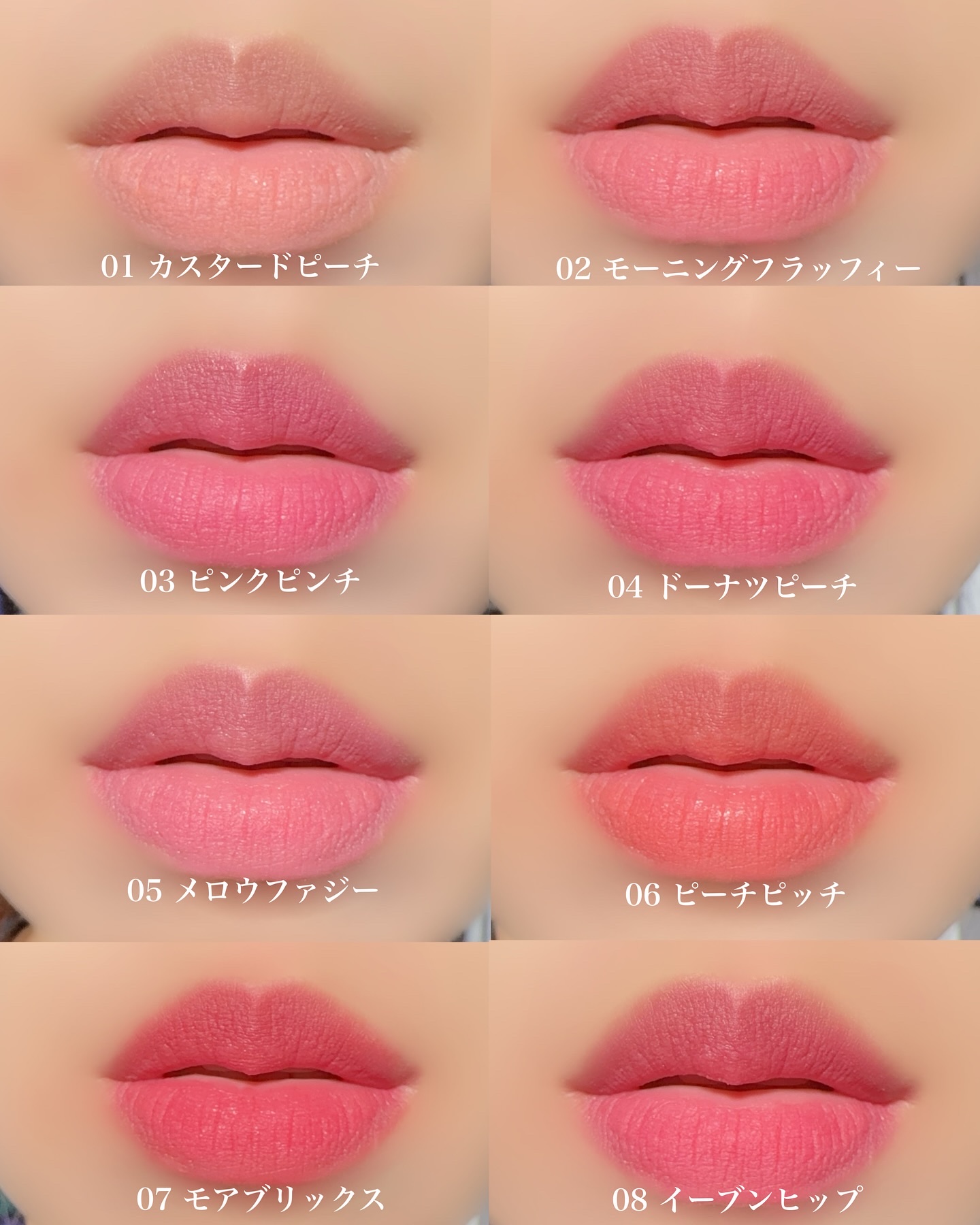 - <01 カスタードピーチ> ジメチコン、シクロペンタシロキサン、ジメチコンクロスポリマー、トリイソステアリン酸ポリグリセリル-2、(ジメチコン/ビニルジメチコン)クロスポリマー、酸化チタン、フェニルトリメチコン、ジフェニルシロキシフェニルトリメチコン、1,2-ヘキサンジオール、セチルPEG/PPG-10/1ジメチコン、シリル化シリカ、ビワ葉エキス、モモ果実エキス、アルキル(C30-45)ジメチコン、サリチル酸ブチルオクチル、メントングリセリンアセタール、シクロヘキサシロキサン、タルク、酢酸トコフェロール、プロパンジオール、水、BG、テトラジブチルヒドロキシヒドロケイヒ酸ペンタエリスリチル、ミドリハッカエキス、フェノキシエタノール、酸化鉄、赤202、黄5、黄4、香料 <02 モーニングフラッフィ> ジメチコン、シクロペンタシロキサン、ジメチコンクロスポリマー、トリイソステアリン酸ポリグリセリル-2、(ジメチコン/ビニルジメチコン)クロスポリマー、酸化チタン、フェニルトリメチコン、ジフェニルシロキシフェニルトリメチコン、1,2-ヘキサンジオール、セチルPEG/PPG-10/1ジメチコン、シリル化シリカ、ビワ葉エキス、モモ果実エキス、アルキル(C30-45)ジメチコン、サリチル酸ブチルオクチル、メントングリセリンアセタール、シクロヘキサシロキサン、タルク、酢酸トコフェロール、プロパンジオール、水、BG、テトラジブチルヒドロキシヒドロケイヒ酸ペンタエリスリチル、ミドリハッカエキス、フェノキシエタノール、酸化鉄、黄5、黄4、赤202、赤104(1)、香料 <03 ピンクピンチ> ジメチコン、シクロペンタシロキサン、ジメチコンクロスポリマー、トリイソステアリン酸ポリグリセリル-2、(ジメチコン/ビニルジメチコン)クロスポリマー、酸化チタン、フェニルトリメチコン、ジフェニルシロキシフェニルトリメチコン、1,2-ヘキサンジオール、セチルPEG/PPG-10/1ジメチコン、シリル化シリカ、ビワ葉エキス、モモ果実エキス、アルキル(C30-45)ジメチコン、サリチル酸ブチルオクチル、メントングリセリンアセタール、シクロヘキサシロキサン、タルク、酢酸トコフェロール、プロパンジオール、水、BG、テトラジブチルヒドロキシヒドロケイヒ酸ペンタエリスリチル、ミドリハッカエキス、フェノキシエタノール、酸化鉄、黄4、黄5、赤202、青1、香料 <04 ドーナツピーチ> ジメチコン、シクロペンタシロキサン、ジメチコンクロスポリマー、トリイソステアリン酸ポリグリセリル-2、(ジメチコン/ビニルジメチコン)クロスポリマー、酸化チタン、フェニルトリメチコン、ジフェニルシロキシフェニルトリメチコン、1,2-ヘキサンジオール、セチルPEG/PPG-10/1ジメチコン、シリル化シリカ、ビワ葉エキス、モモ果実エキス、アルキル(C30-45)ジメチコン、サリチル酸ブチルオクチル、メントングリセリンアセタール、シクロヘキサシロキサン、タルク、酢酸トコフェロール、プロパンジオール、水、BG、テトラジブチルヒドロキシヒドロケイヒ酸ペンタエリスリチル、ミドリハッカエキス、フェノキシエタノール、酸化鉄、黄4、黄5、赤202、青1、香料 <05 メロウファジー> ジメチコン、シクロペンタシロキサン、ジメチコンクロスポリマー、トリイソステアリン酸ポリグリセリル-2、(ジメチコン/ビニルジメチコン)クロスポリマー、酸化チタン、フェニルトリメチコン、ジフェニルシロキシフェニルトリメチコン、1,2-ヘキサンジオール、セチルPEG/PPG-10/1ジメチコン、シリル化シリカ、ビワ葉エキス、モモ果実エキス、アルキル(C30-45)ジメチコン、サリチル酸ブチルオクチル、メントングリセリンアセタール、シクロヘキサシロキサン、タルク、酢酸トコフェロール、プロパンジオール、水、BG、テトラジブチルヒドロキシヒドロケイヒ酸ペンタエリスリチル、ミドリハッカエキス、フェノキシエタノール、酸化鉄、黄4、黄5、赤202、青1、香料 <06 ピーチピッチ> ジメチコン、シクロペンタシロキサン、ジメチコンクロスポリマー、トリイソステアリン酸ポリグリセリル-2、(ジメチコン/ビニルジメチコン)クロスポリマー、酸化チタン、フェニルトリメチコン、ジフェニルシロキシフェニルトリメチコン、1,2-ヘキサンジオール、セチルPEG/PPG-10/1ジメチコン、シリル化シリカ、ビワ葉エキス、モモ果実エキス、アルキル(C30-45)ジメチコン、サリチル酸ブチルオクチル、メントングリセリンアセタール、シクロヘキサシロキサン、タルク、酢酸トコフェロール、プロパンジオール、水、BG、テトラジブチルヒドロキシヒドロケイヒ酸ペンタエリスリチル、ミドリハッカエキス、フェノキシエタノール、酸化鉄、黄4、黄5、赤202、赤104(1)、香料 <07 モアブリックス> ジメチコン、シクロペンタシロキサン、ジメチコンクロスポリマー、トリイソステアリン酸ポリグリセリル-2、(ジメチコン/ビニルジメチコン)クロスポリマー、酸化チタン、フェニルトリメチコン、ジフェニルシロキシフェニルトリメチコン、1,2-ヘキサンジオール、セチルPEG/PPG-10/1ジメチ