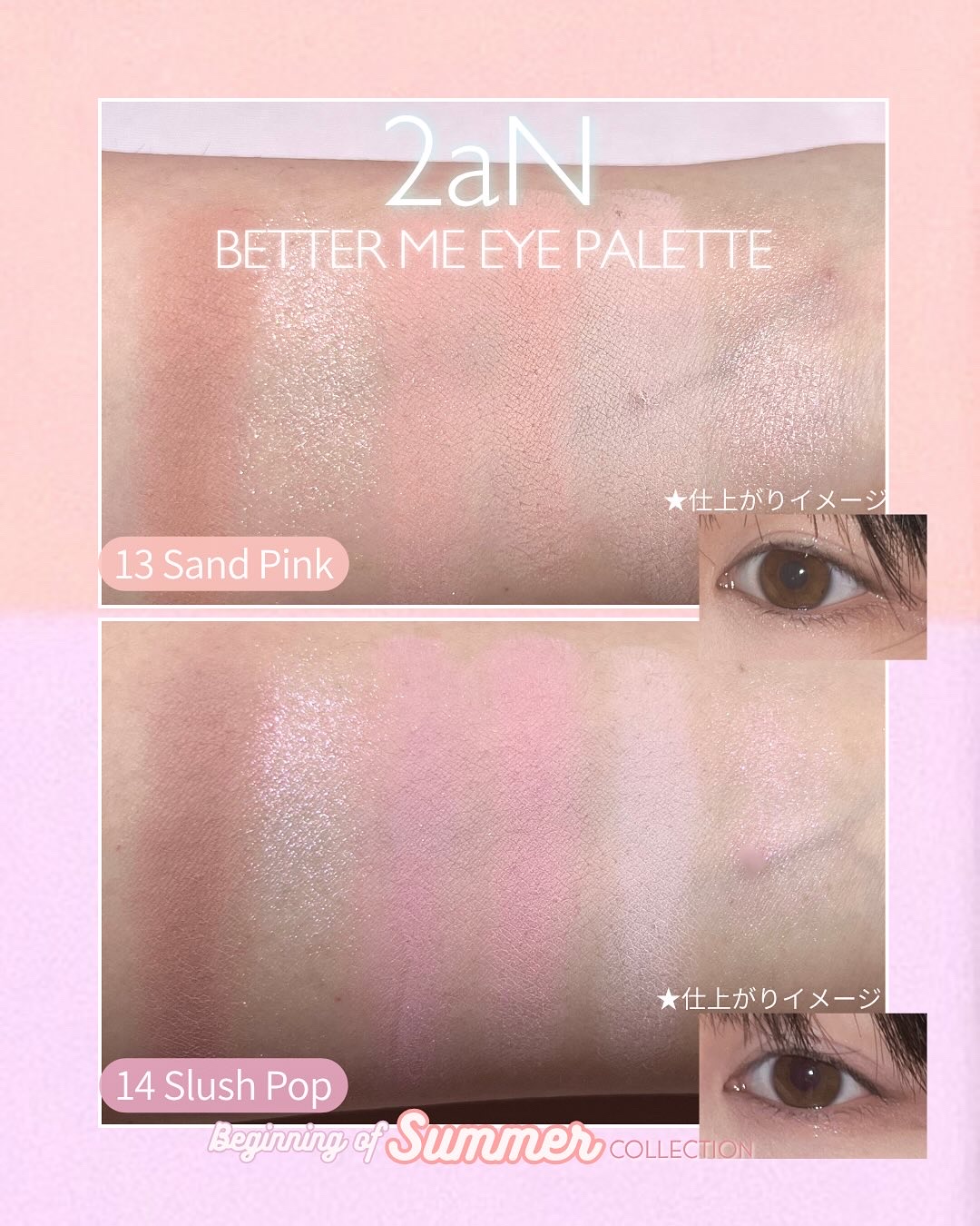 *2aN可愛すぎる夏の新作!!▷ベターミーアイパレット13SandPink14SlushPop粉質がすごいしっとりで好き♡淡い発色で締め色なしの使いやすいパレット!▷ピュアグラッシュハイライター OR02SunnyBeamゴールドオレンジカラ...