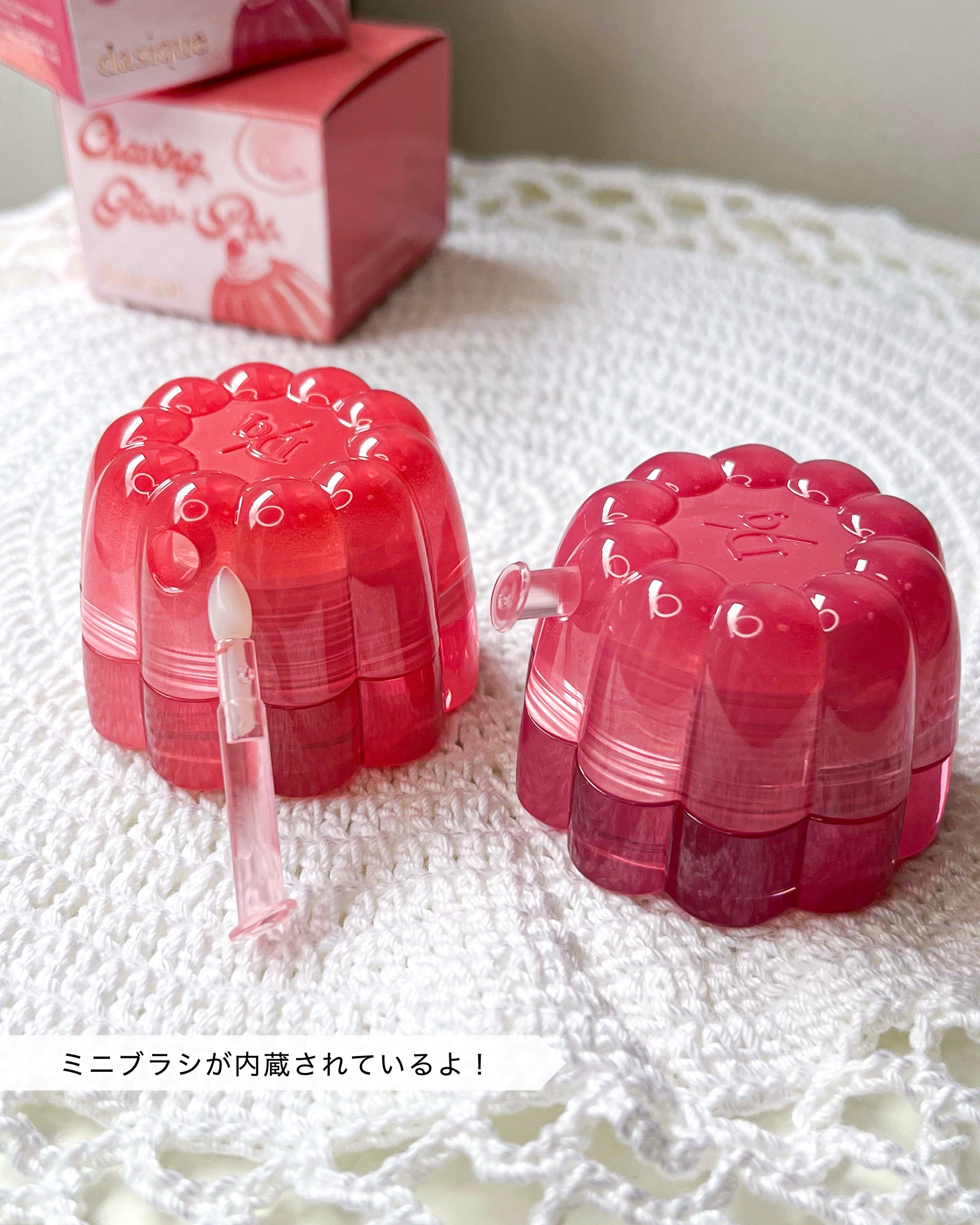 - プリンのような新感覚のチューイングテクスチャーに澄んだカラー感が加わったリップ&チーク。 ぷるぷるとしたゼリーのようなツヤ感が唇と頬にほのかに染まるウォーターリーグロウリップ&チーク。 甘いプリンのようにぷるぷるとした新感覚のチューイングテクスチャーで、べたつかず、なめらかに密着し唇にしっとりとした保湿感を与えます。 イエベ、ブルベの自分の肌トーンごとに使いやすい20色の多彩なカラーバリエーション、透明感のある澄んだカラーと鮮やかな発色、重ね塗りすればするほどあふれ出す、ほのかな水光リップへ導きます。 可愛いプリンのようなラブリーなパッケージで持ち運びが簡単!パッケージの中にはミニブラシが付いていて、衛生的に使えます。 ※ふんわりとしたゼリーテクスチャーの特徴により、固まりが生じることがありますので、薄くレイヤーを重ねて十分に塗り伸ばしてください。