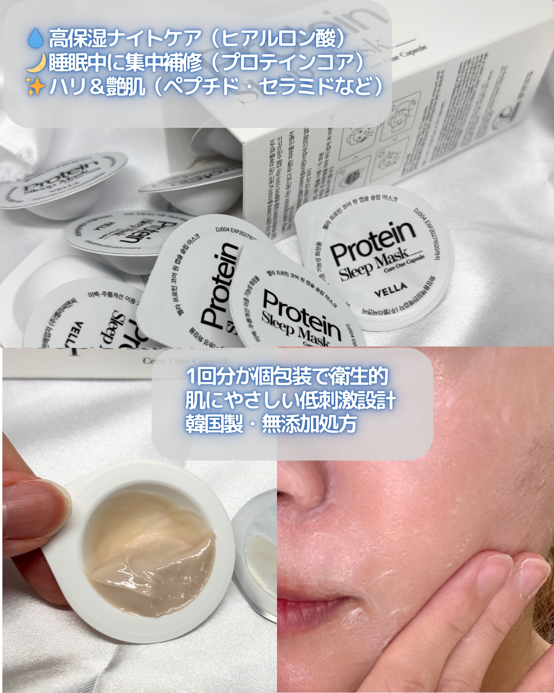#PRVELLA様からいただきました◆プロテインコアワンカプセルスリープマスクつけて寝るだけの簡単ケアを実現するスリーピングマスク♡タンパク質とセラミドを含んだクリームは、一見こってりに見えるのに、実際には伸びも良く軽い!!そしてびっくりした...